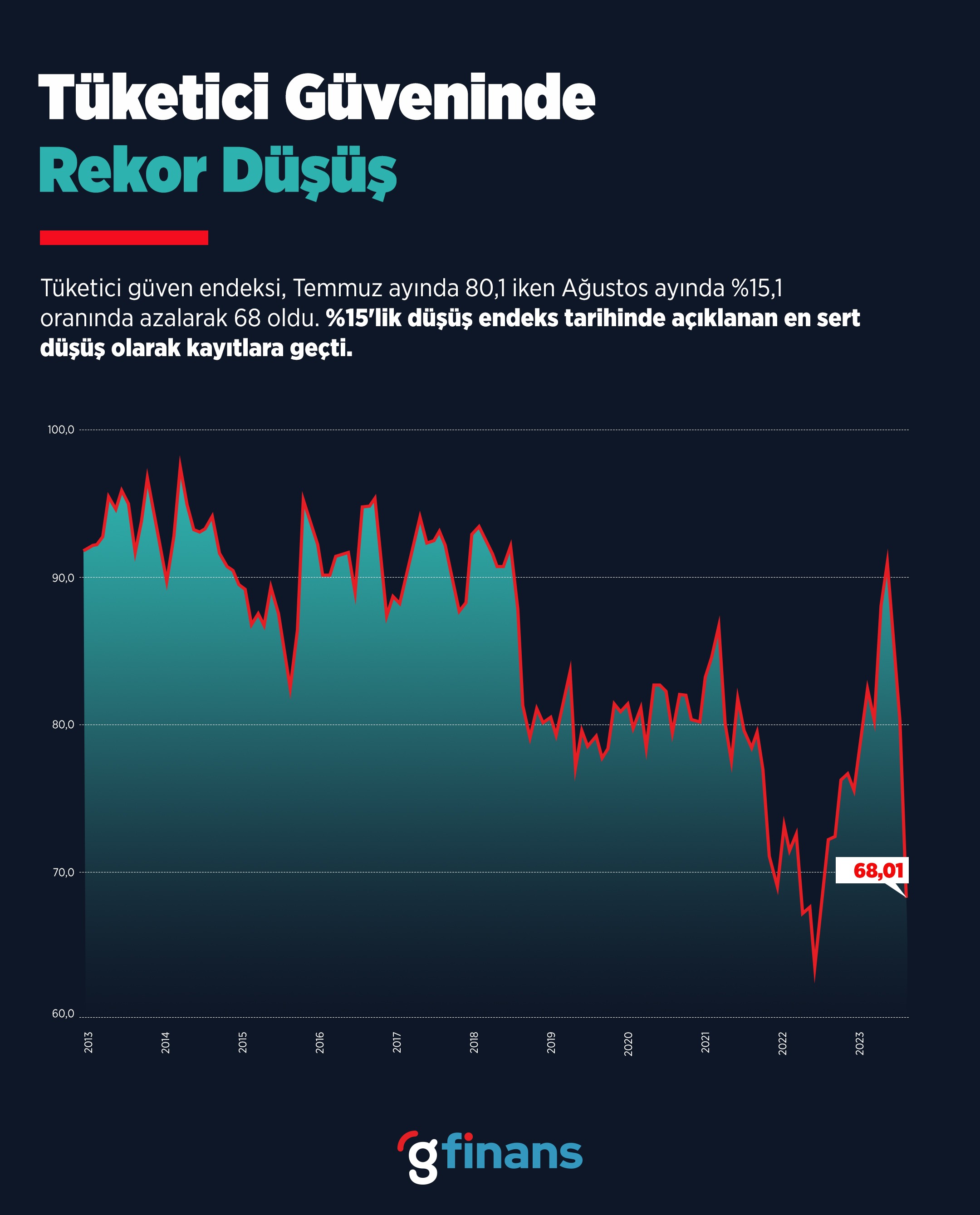 Tüketici güven endeksi, Temmuz ayında 80,1 iken Ağustos ayında %15,1 oranında azalarak 68’e geriledi. %15'lik düşüş endeks tarihinde gerçekleşen en sert düşüş oldu.