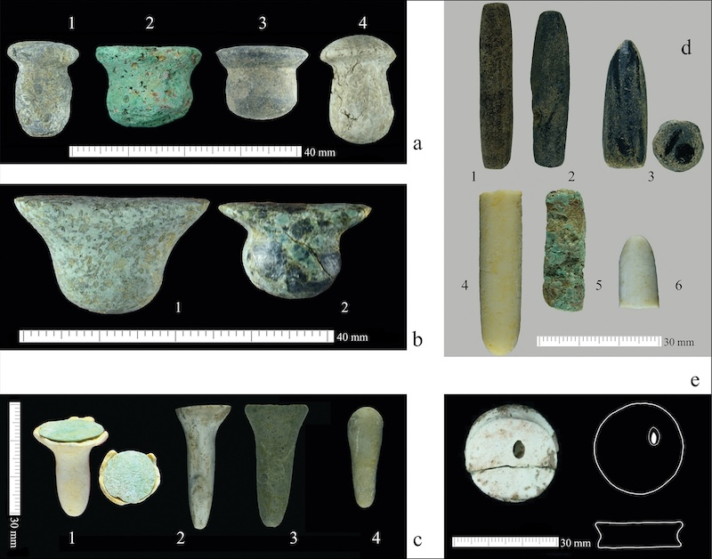 Mezarlarda bulunan süs objelerinin 85’i bütün haldeydi ve çoğu kireçtaşı, obsidyen veya nehir çakıllarından yapılmıştı. Söz konusu objelerin değişen boyutları ve şekilleri, bunların hem kulak hem de alt dudak piercing’leri olarak kullanılmak üzere yapıldığını gösteriyor.