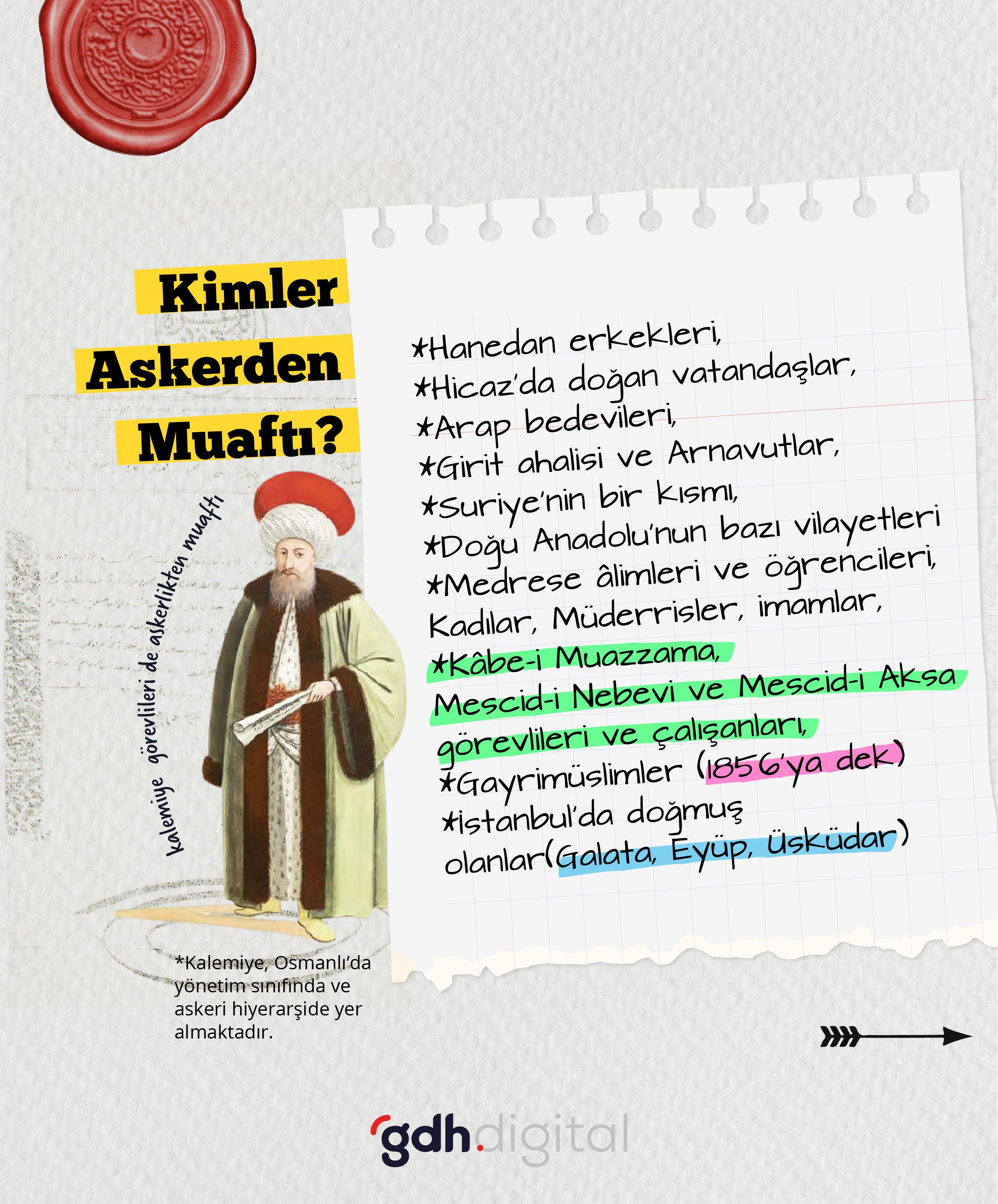Bu zorlukların yanında Osmanlı’da askerden muafiyet durumları da söz konusu kanun ve uygulamalarda geniş yer alıyordu.