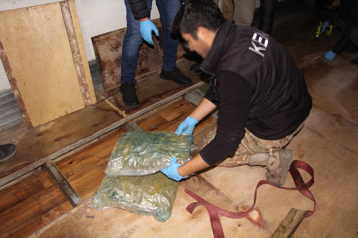 Aramada tır dorsesinin taban kısmına gizlenmiş vaziyette 160 şeffaf poşet halinde yaklaşık 180 kilogram esrar cinsi uyuşturucu madde ele geçirildi.