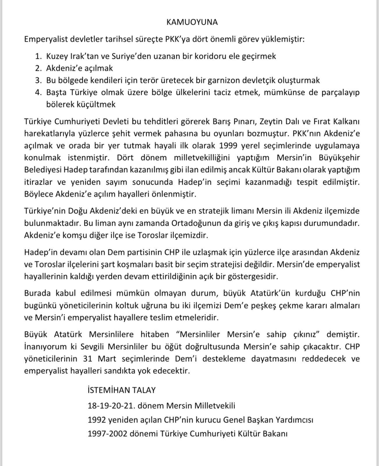 Burada kabul edilmesi mümkün olmayan durum, büyük Atatürk'ün kurduğu CHP'nin bugünkü yöneticilerinin koltuk uğruna bu iki ilçemizi Dem'e peşkeş çekme kararı almaları ve Mersin'i emperyalist hayallere teslim etmeleridir.