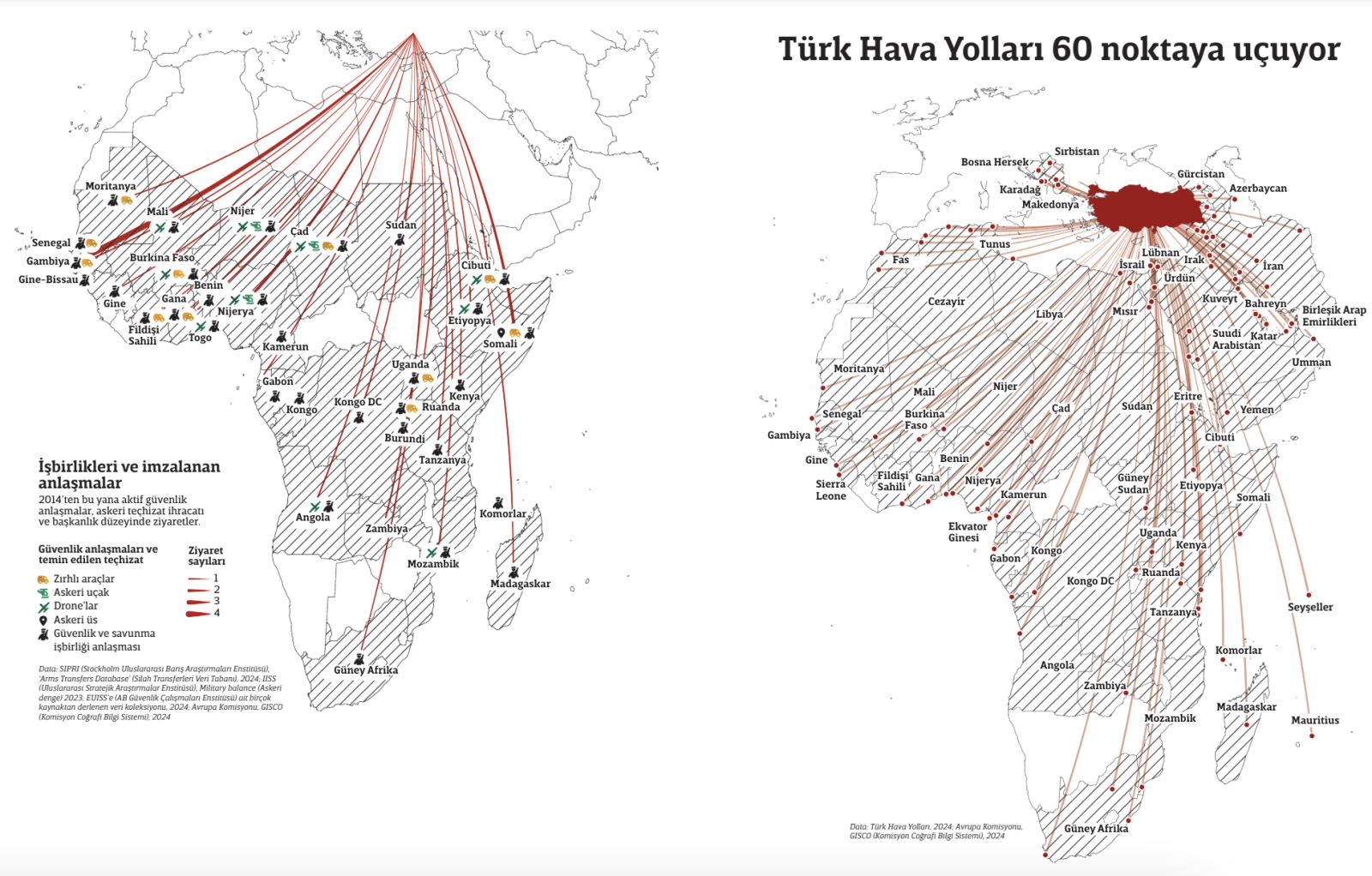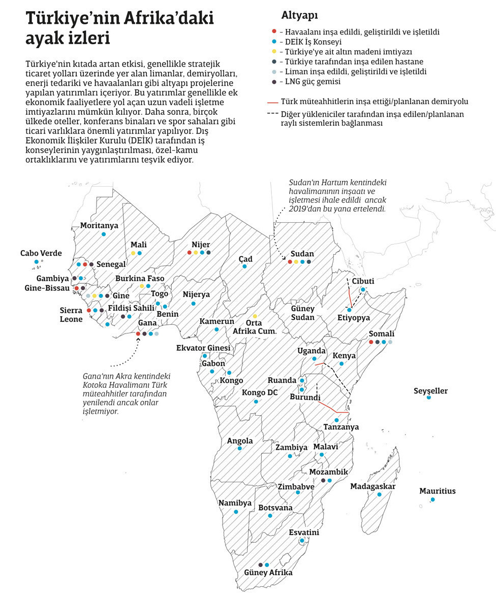 Türkiye Libya’da Mısır, Fransa, Rusya ve Birleşik Arap Emirlikleri (BAE) tarafından desteklenen Hafter rejimine karşı Trablus hükümetini askeri yardımlarla destekleyerek bölgede ‘ben de varım’ dedi. Somali’de atılan adımlar, Suudi Arabistan ve Birleşik Arap Emirlikleri ile Ankara’yı karşı karşıya getirdi. Türkiye Nijerya, Senegal ve Togo olmak üzere çeşitli Afrika ülkeleriyle askeri anlaşmalar imzaladı. Bu ülkelerin birçoğu Türkiye’nin terörle mücadele konusundaki deneyiminden faydalandı.