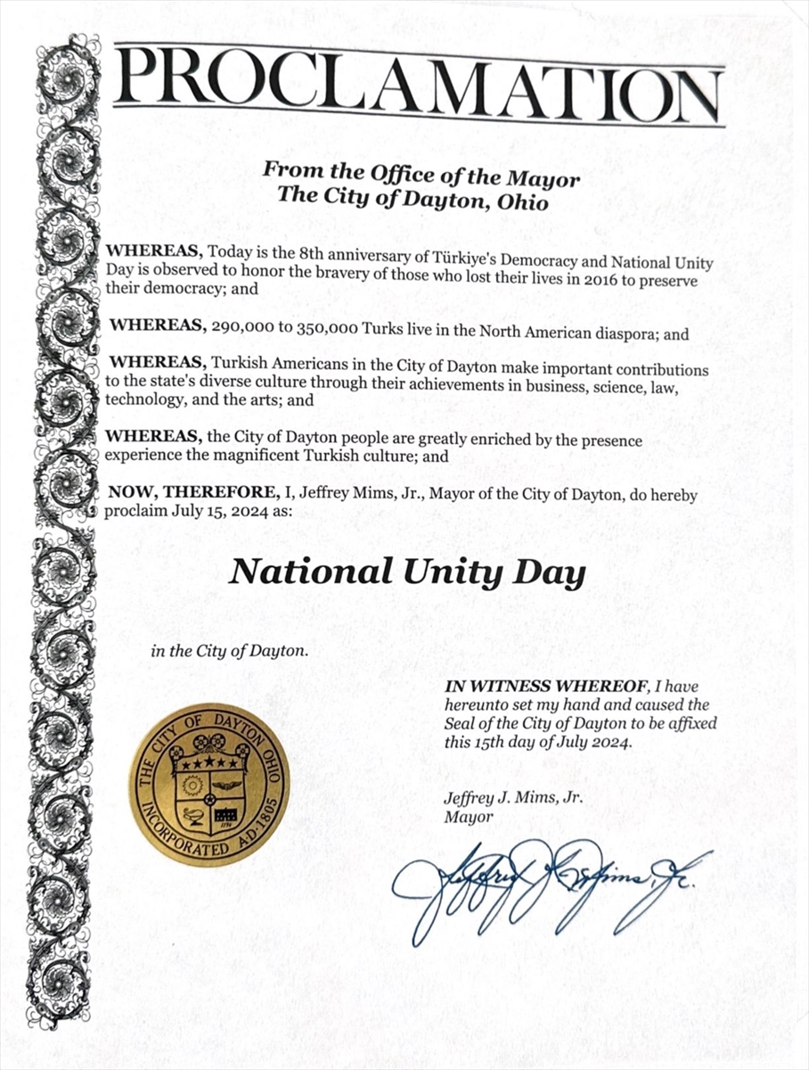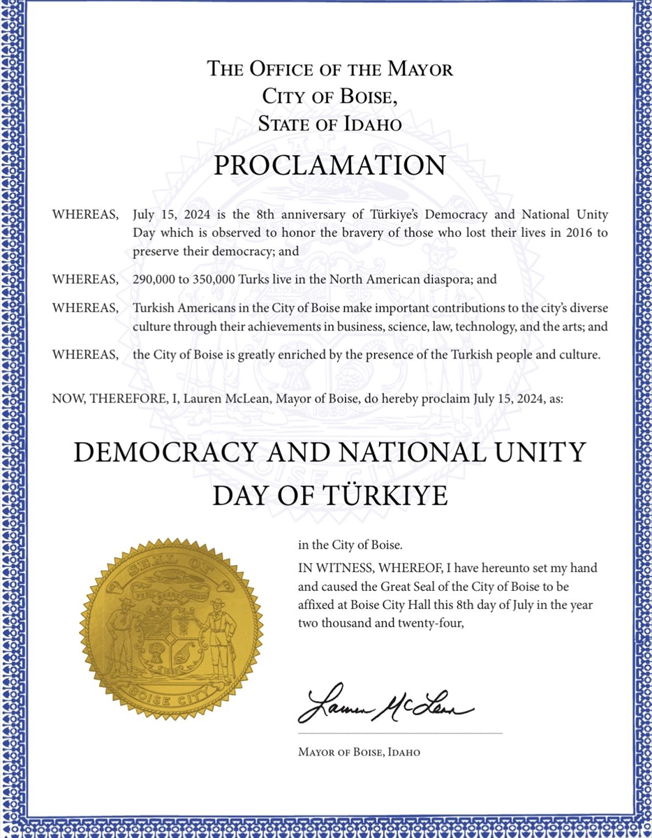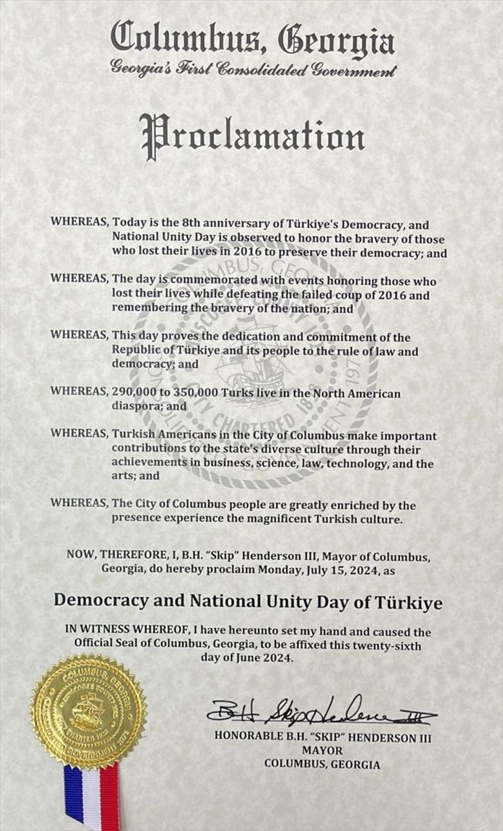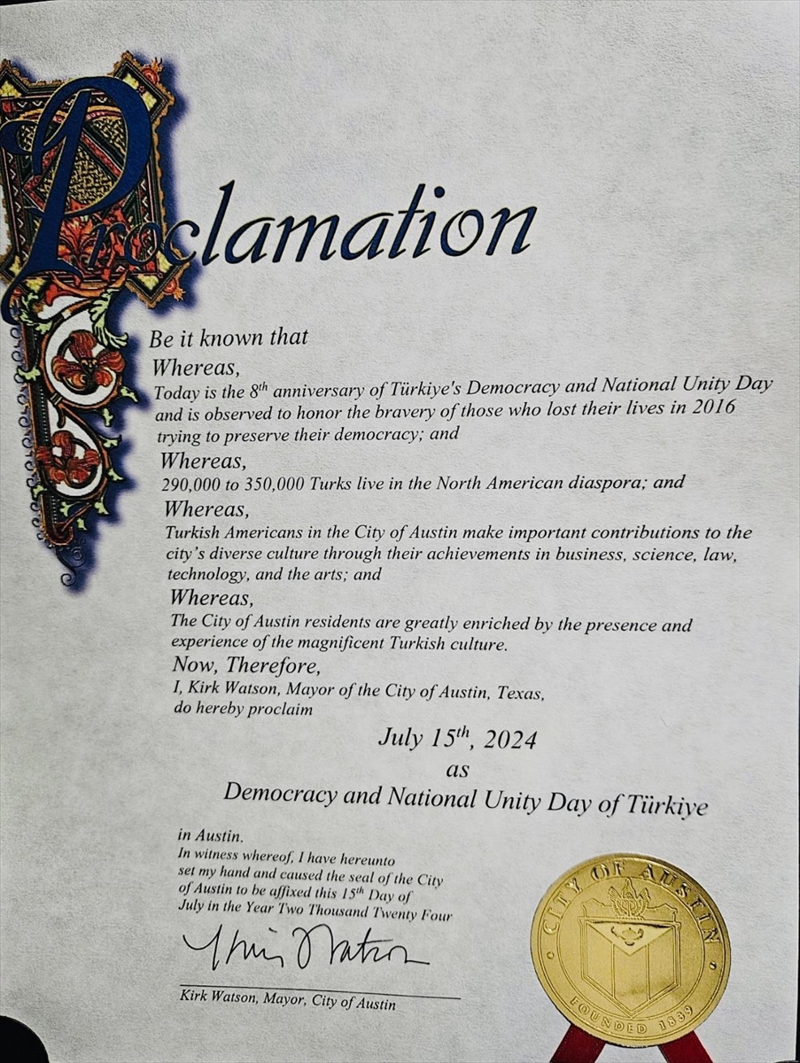 ABD'de Texas, Idaho, Ohio ile Georgia eyaletlerindeki bazı kentlerin 15 Temmuz Demokrasi ve Milli Birlik Günü'nü resmen tanıdıkları bildirildi.