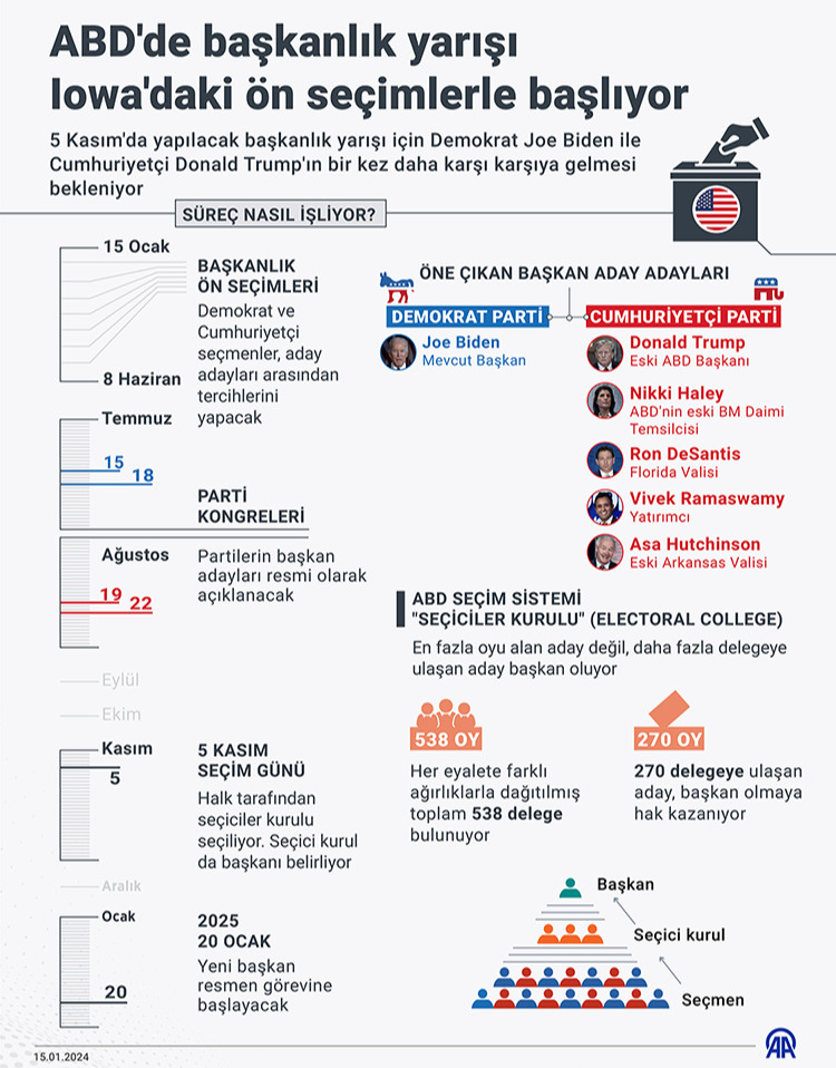 ABD'de başkanlık seçimleri geleneksel olarak Iowa'da başlarken 23 Ocak'ta New Hampshire, 3 Şubat'ta Güney Carolina, 6 Şubat'ta Nevada, 24 Şubat'ta Güney Carolina, 27 Şubat'ta Michigan, 2 Mart'ta Idaho ile Missouri, 3 Mart'ta başkent Washington DC (Cumhuriyetçiler), 4 Mart'ta ise Kuzey Dakota'daki seçmenler, kendi partilerinin ön seçimlerinde oy kullanacak.