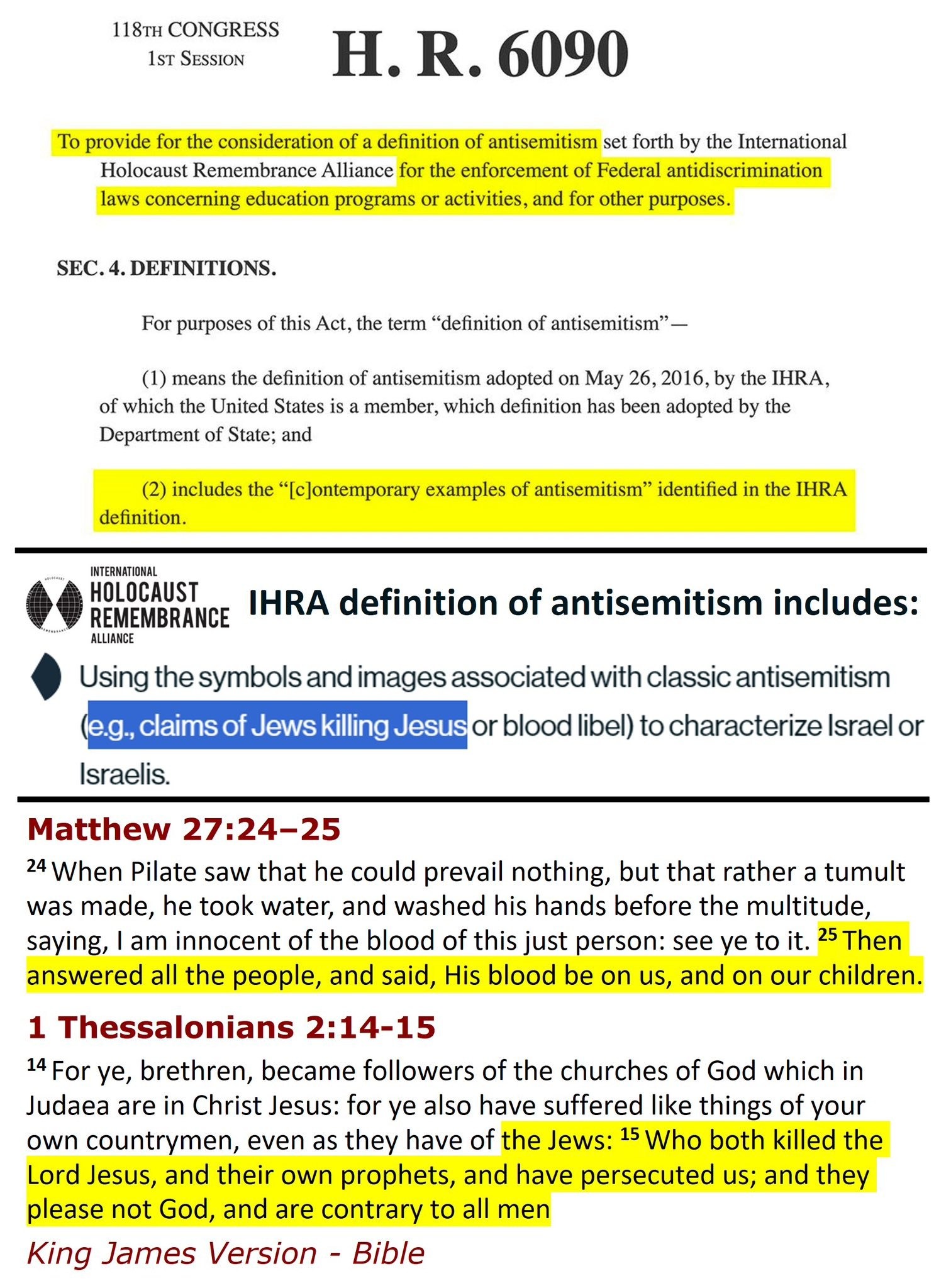 Zira; H.R. 6090 tasarısı, papazların kilisede Hz. İsa'yı Yahudilerin öldürdüğünü açıkça ifade eden Thessalonians 2:15 gibi İncil ayetlerine uygun vaazlar vermesini suç haline getirebilir ve kiliseler “antisemitizm” davalarının hedefi haline gelebilir.