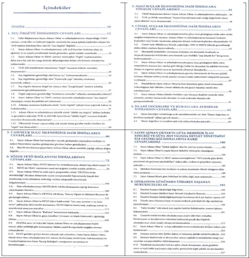 İstanbul Cumhuriyet Başsavcılığı Terör ve Örgütlü Suçlar Soruşturma Bürosu, Adnan Oktar organize suç örgütünün güncel yapılanmasına yönelik başlattığı soruşturma tamamlandı. 352 sayfalık iddianamede, Adnan Oktar, Meltem Daban ve Ferhunde Eda Babuna'nın da aralarında bulunduğu 20 şüpheli yer alırken, İddianamede, Adnan Oktar'ın cezaevindeyken dışarıda bulunan örgüt üyelerine 'Kumpas' adında bir kitap yazılması yönünde talimat verdiği belirtildi. Oktar'ın itirafçı olma ihtimali bulunan örgüt üyeleri hakkında sosyal medyada paylaşımlarının çoğaltılması için de talimat verdiği bilgisi yer aldı.