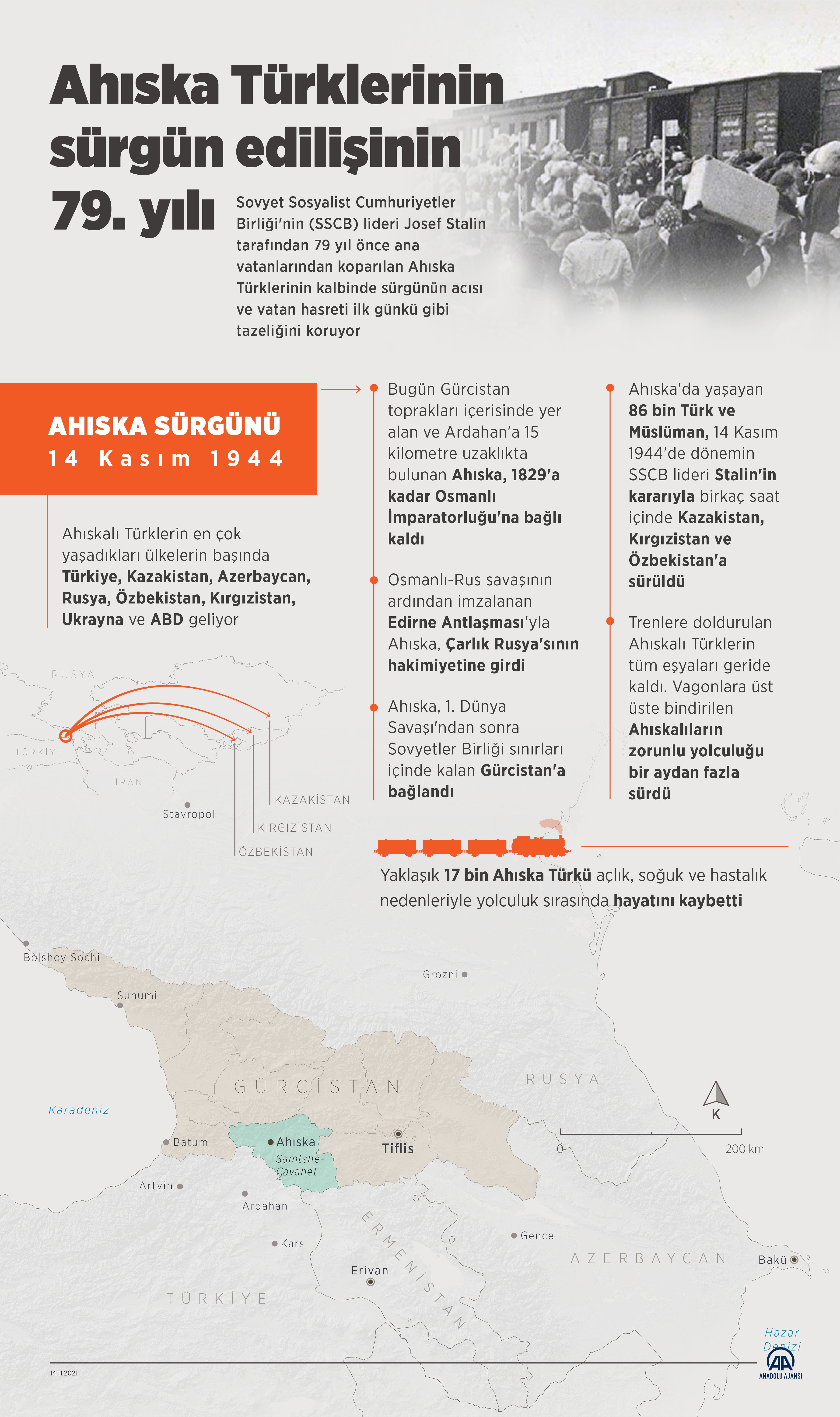 Sovyetler Birliğinin lideri Stalin, 14 Kasım 1944'te, Gürcistan'ın Türkiye sınırına yakın bölgesi Ahıska'da yaşayan Türkleri birkaç saat içinde trenlere doldurarak sürgüne gönderdi.
