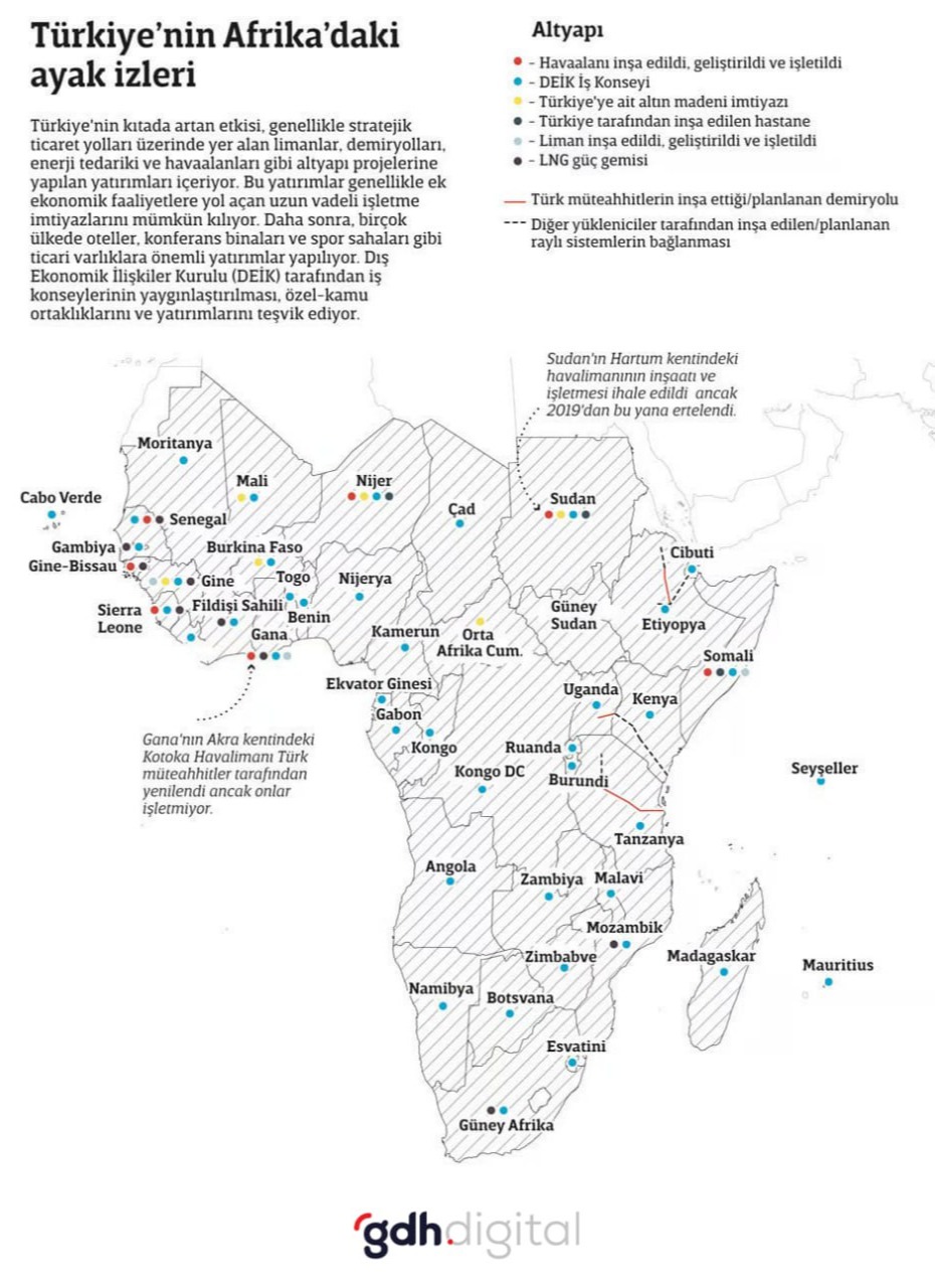 Türk İşbirliği ve Koordinasyon Ajansı Başkanlığı’nın (TİKA) 22 ofis kurması ve Maarif Vakfı’nın onlarca ülkede 200’e yakın okul işletmesi ile Türkiye uzun zamandır Afrika’da güçlü bir varlık gösteriyor. Bu durum Türk inşaat projelerinin çoğalmasına yol açtı.
