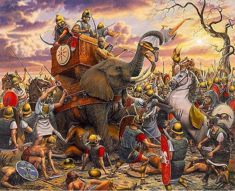 Epirus Kralı Pirus, Argos’taki bir anlaşmazlığı savaş fillerinden oluşan bir filosuyla çözmeye çalışırken küçük düşürücü bir yenilgiye uğradı. Hikâyeye göre savaş meydanından ayrılma vakti geldiğinde ölen savaş fillerinden birinin cesedi çıkışı kapatıyordu ve bu durum kalan fil süvarilerini çılgına çevirdi.
