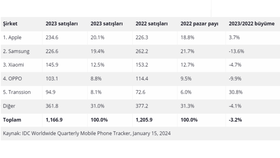 IDC, 2023 yılında küresel akıllı telefon satışlarını gösteren tabloyu paylaştı. Apple, 13 yıl sonra ilk kez Samsung'dan daha fazla telefon satışı gerçekleştirdi.