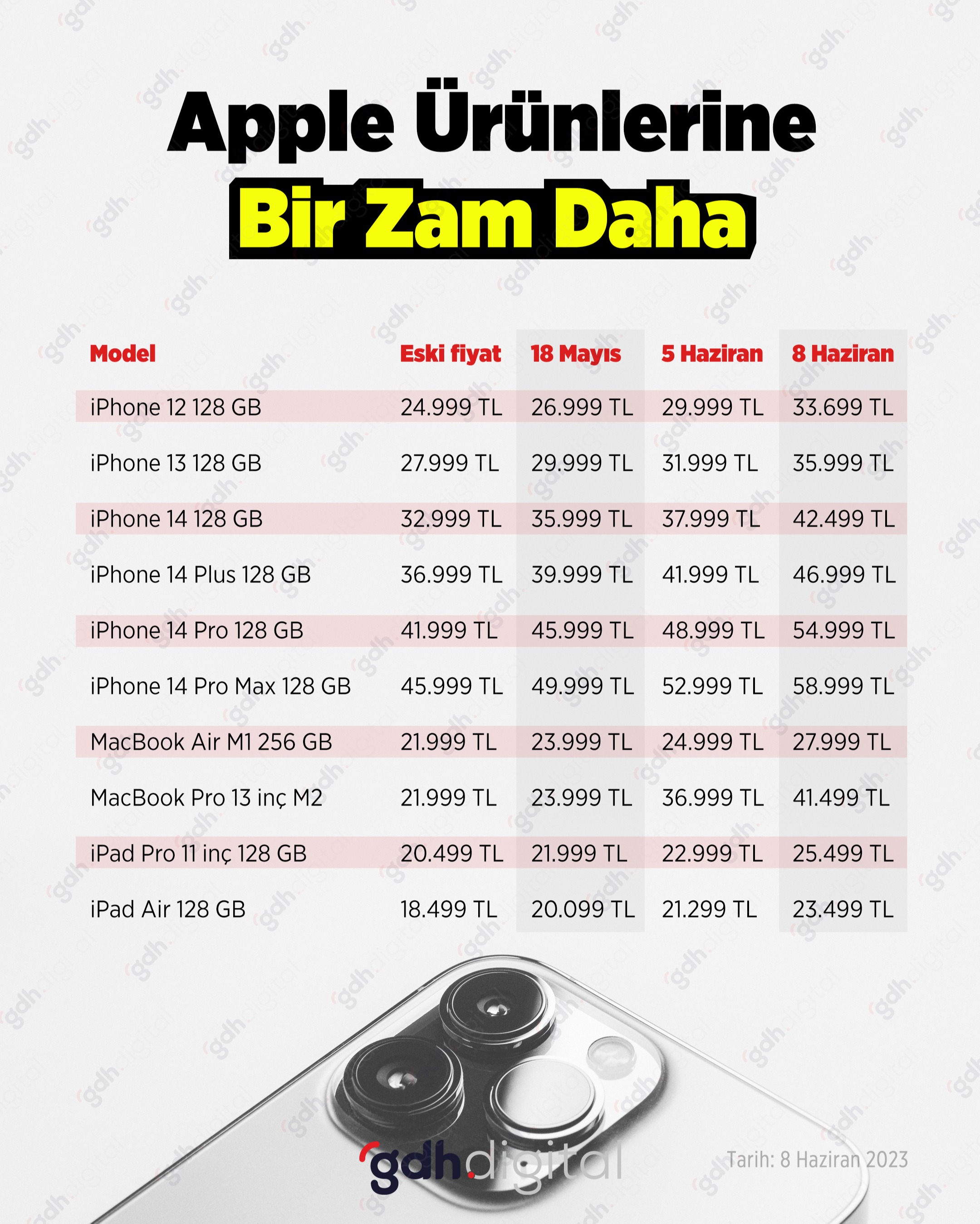 Apple, Mayıs ayında tüm ürünlerine yüzde 10 zam yapmıştı. Mayıs ayında yapılan zamların ardından 5 Haziran ve 8 Haziran tarihlerinde fiyatlarını tekrar güncelledi.