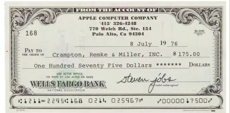 Apple 1'in yanı sıra, 1976'da Jobs ve Wozniak tarafından imzalanan çek de satışa çıkarıldı.