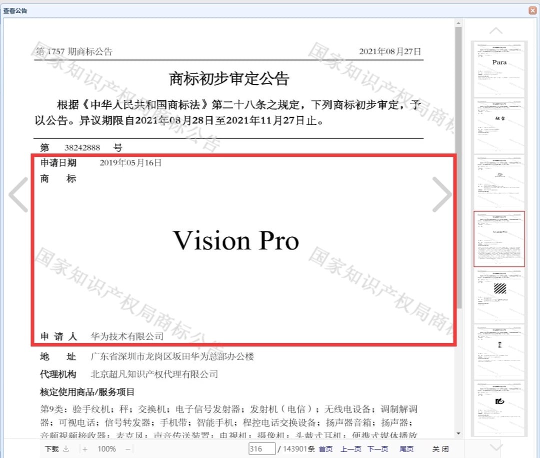 Huawei Central tarafından bugün paylaşılan habere göre "Vision Pro" adı Huawei tarafından 16 Mayıs 2019 tarihinde ticari marka olarak tescil ettirilmiş.