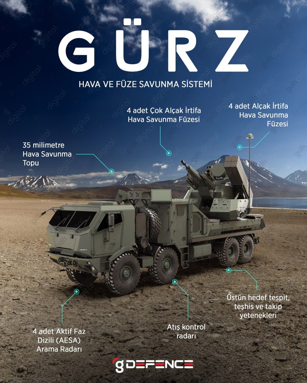GÜRZ, çok alçak ve alçak irtifalı hava tehditlerine karşı geliştirilmiş, tam otonom yapısıyla dikkat çeken bir sistem.