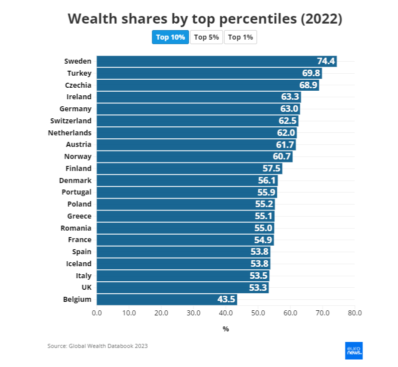 2022'de en zengin ondalık incelendiğinde, zengin %10'un servetin %74.4'üne sahip olduğu İsveç, en yüksek servet eşitsizliğine sahipti. En düşük eşitsizlik değeri ise %43.5 ile Belçika'ya ait.