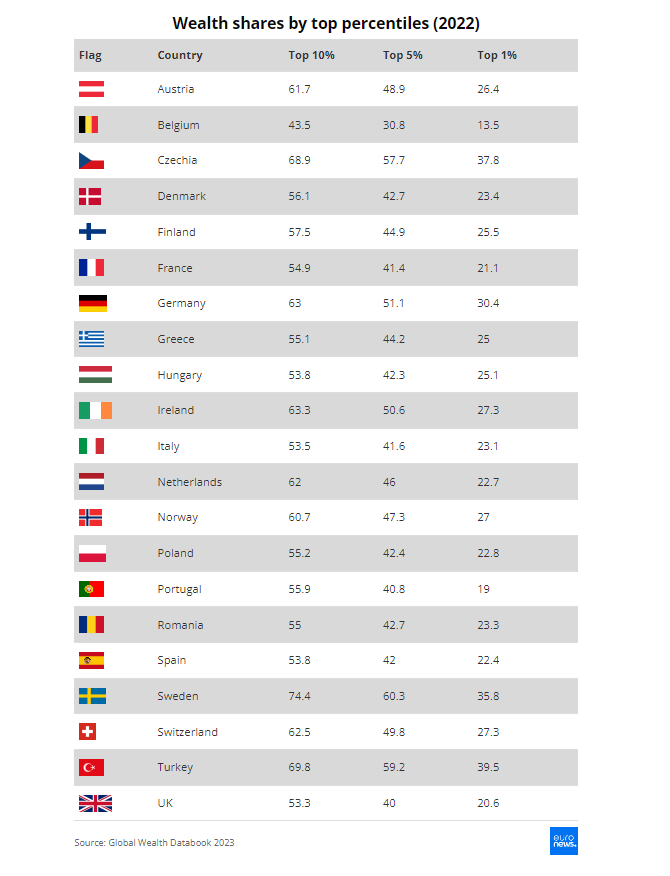 Gelir dağılımındaki eşitsizlik dünya genelinde oldukça belirgin ve Avrupa bundan istisna değil. Kıtanın en zengin %10'u servetin şaşırtıcı bir şekilde %67'sine sahip.