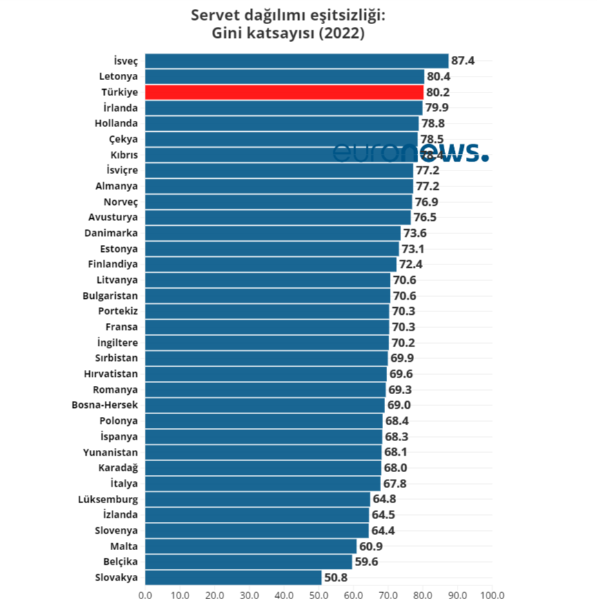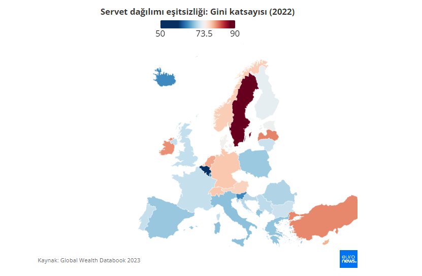 İncelenen 36 Avrupa ülkesi arasında 2022'de servet eşitsizliği, Slovakya'da 50.8'den İsveç'te 87.4'e kadar değişmektedir.