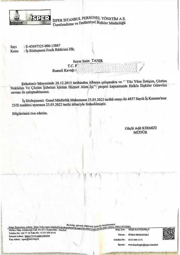 Rumeli Kavağı'nda oturan ve fotoğrafı çektiği iddia edilen kişinin İBB personeli olan 2 arkadaşının iş akitleri fesh edilerek, "yüz kızartıcı suç"tan tazminatsız olarak kovuldular.