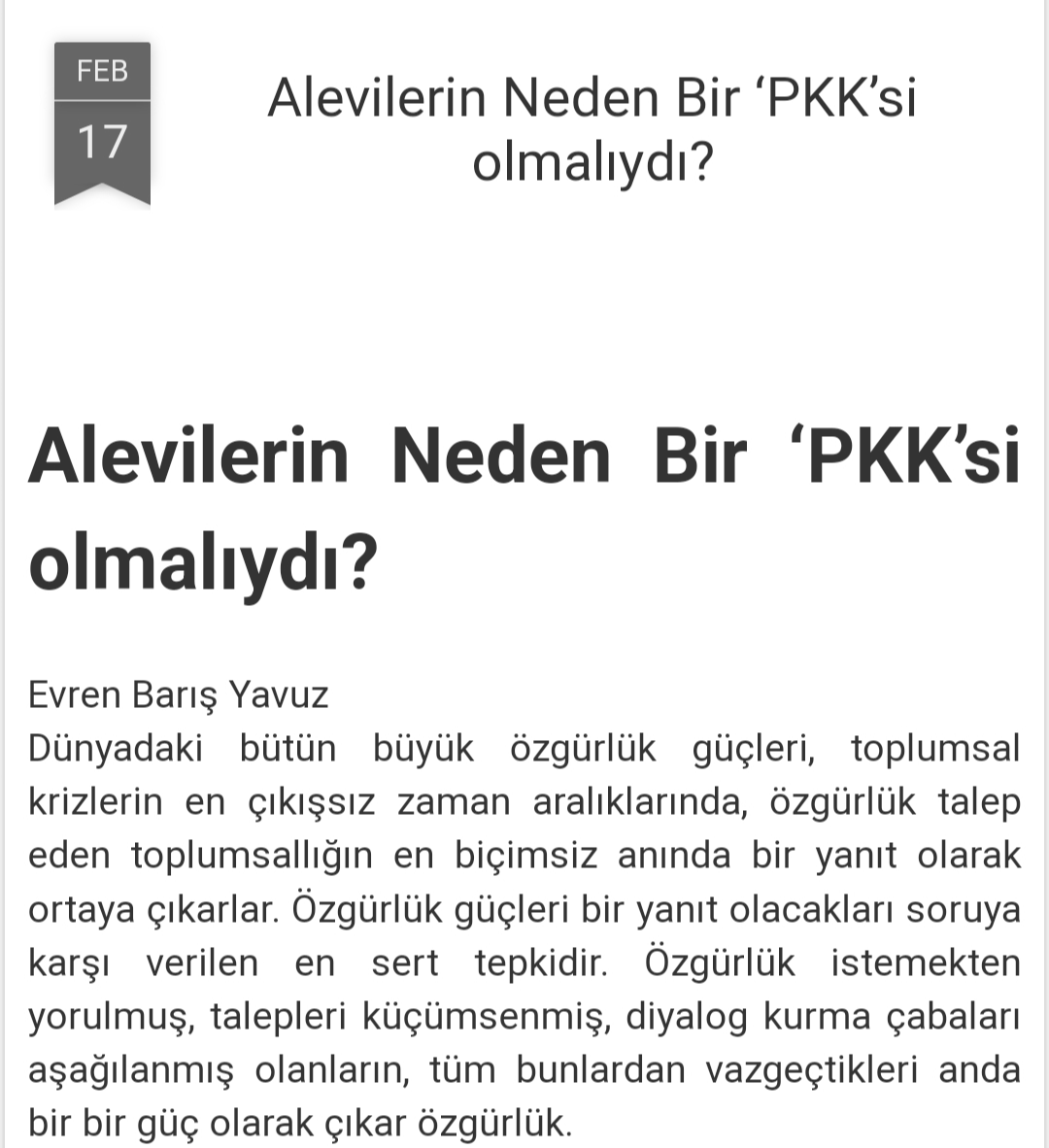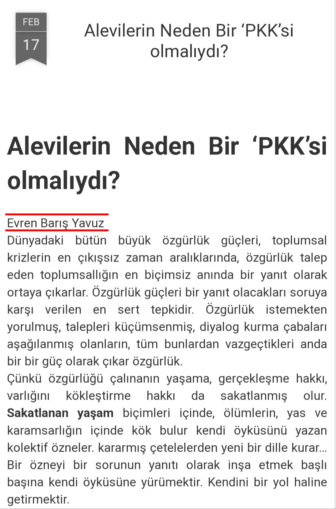 “Alevilerin Neden Bir PKK’sı Olmalıydı?” başlıklı bir yazıya imza atan Yavuz, Alevi vatandaşlara adeta neden terör estirmiyorsunuz? sorusu yönelterek, akıl hocalığı rolüne soyunuyor.