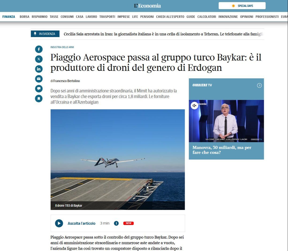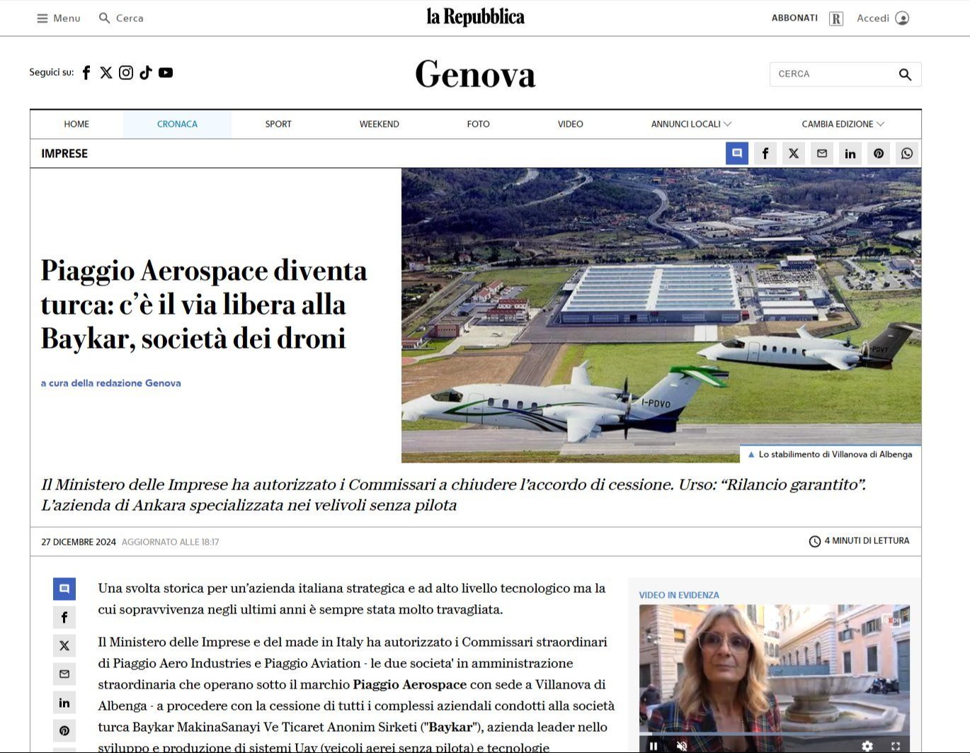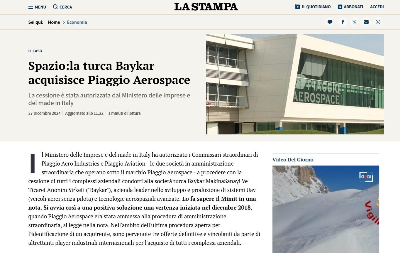 Türkiye’nin lider savunma ve havacılık şirketi Baykar’ın, 140 yıllık İtalyan havacılık devi Piaggio Aerospace’i satın alması, İtalya basınında büyük ilgi gördü.