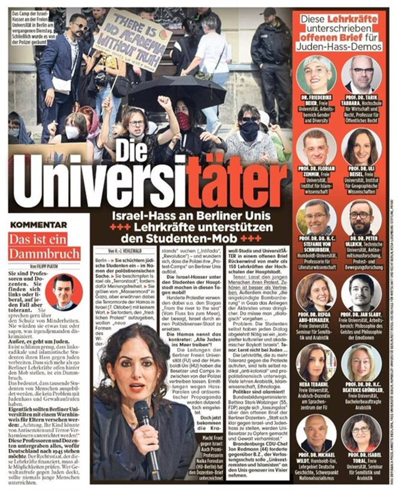 Berlin Humboldt Üniversitesi ve Hür Üniversitesi yönetimlerinin, göstericileri kampüsten uzaklaştırdığı ve nefret söylemleri ve antisemitizm propagandasından dolayı soruşturma başlatıldığı aktarılan haberde, şimdi ise 150’den fazla öğretim üyesinin, açık mektupla öğrencilere destek verdiği kaydedildi. Berlin’in farklı üniversitelerinde görev yapan 13 öğretim üyesinin fotoğrafları ile isimleri ve nerede görev yaptıkları bilgisinin yer aldığı haberde öğretim üyelerine 'radikal' oldukları suçlamasında da bulunuldu.