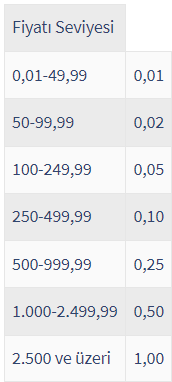 Söz konusu sermaye piyasası araçlarında gerçekleştirilen piyasa yapıcılık faaliyeti çerçevesinde geçerli olan maksimum kotasyon yayılma aralıklarında da değişikliğe gidilerek maksimum yayılma aralığı adım sayısı/ % fiyat aralığı, fiyat seviyesi 0,01-1 TL arasında olanlar için 6, 1,01-2,50 arasında olanlar için 8, 2,51-10 TL arasında olanlar için 10, 10,01 ve üzeri olanlar için ise yüzde 1 olarak belirlendi.