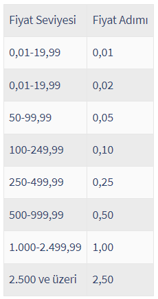 Buna göre, Paylar yeni pay alma hakları, gayrimenkul sertifikaları, sahipliğe dayalı kira sertifikaları, borsa yatırım fonları, gayrimenkul yatırım fonları ve girişim sermayesi yatırım fonları işlem sıralarında geçerli olan fiyat adımı uygulaması yeniden düzenlendi.
