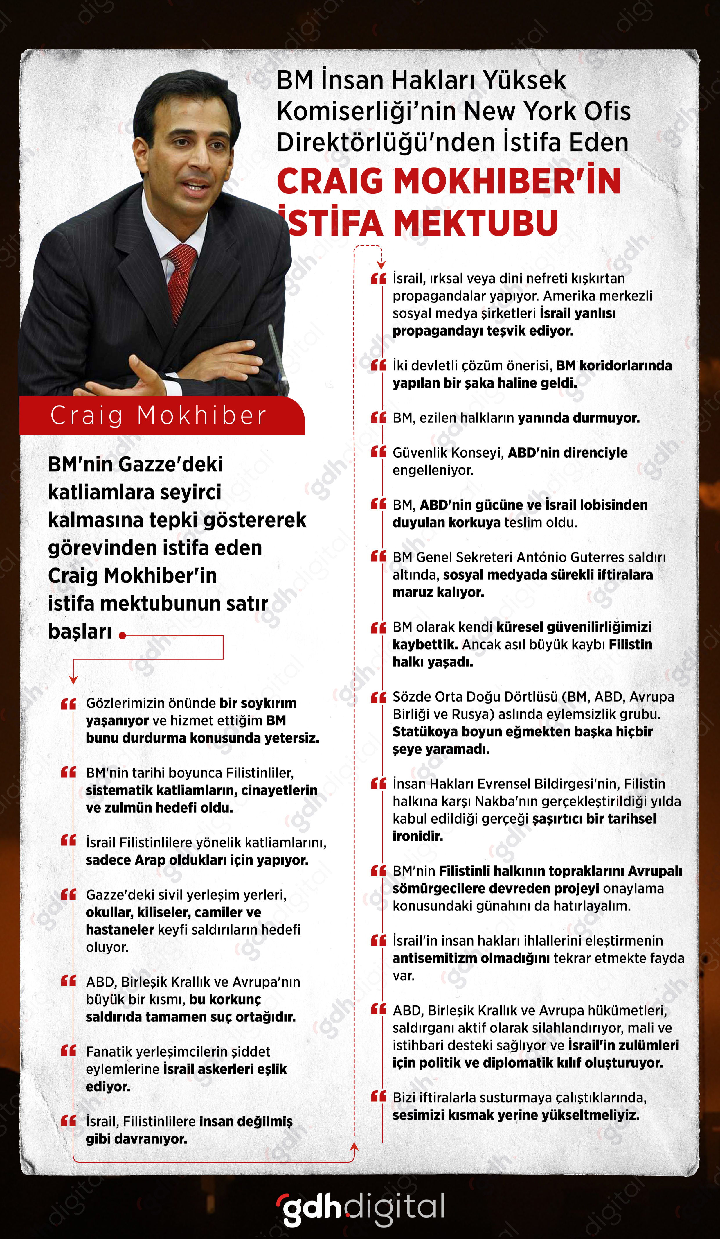 Craig Mokhiber, Cenevre'deki Birleşmiş Milletler İnsan Hakları Yüksek Komiseri Volker Turk’e yazdığı mektupta, "Bir kez daha gözlerimizin önünde bir soykırım yaşandığını görüyoruz ve hizmet ettiğimiz örgüt bunu durdurmak için yetersiz görünüyor" dedi.