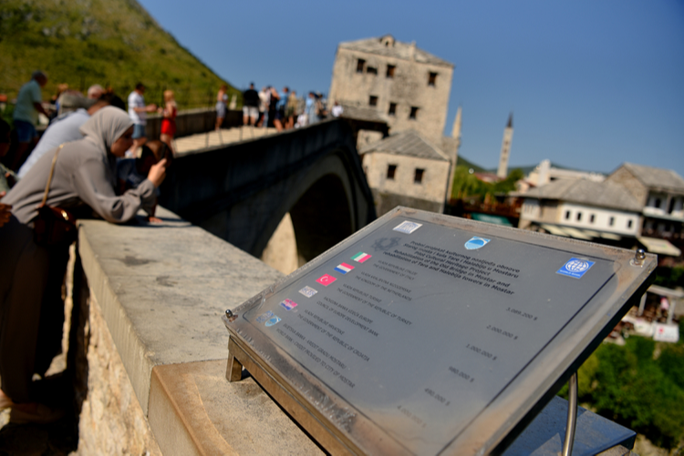 Mostar Köprüsü'nün yeniden inşasına, Türk İşbirliği ve Koordinasyon Ajansı, Birleşmiş Milletler Eğitim, Bilim ve Kültür Örgütü (UNESCO), İslam Tarih, Sanat ve Kültür Araştırma Merkezi ve Dünya Bankasının desteğiyle 1997'de başlandı.