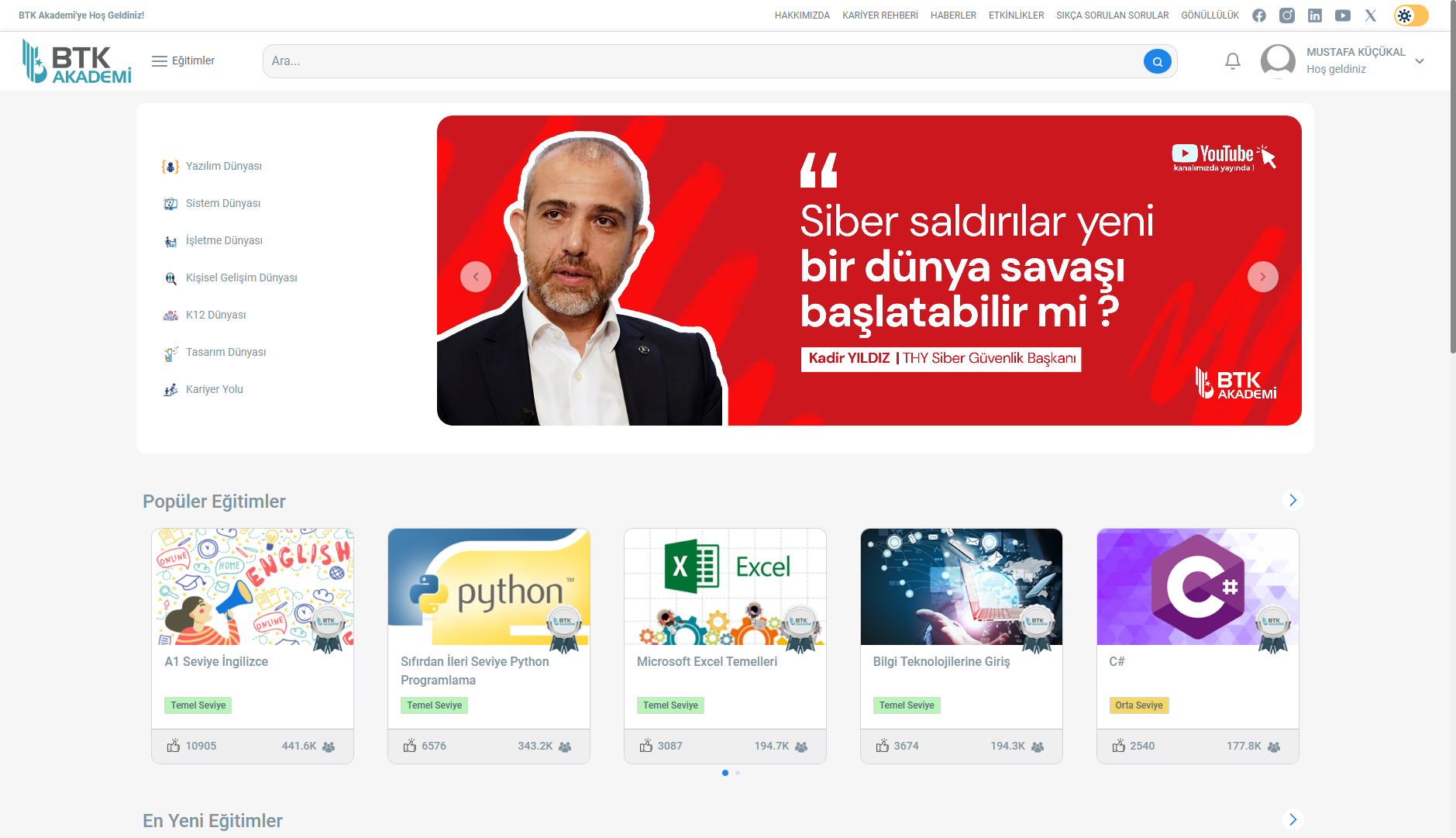 Bakan Uraloğlu, BTK Akademi eğitim portalının bugün itibarıyla kayıtlı kullanıcı sayısının toplamda 2 milyon 258 bin 273’e ulaştığına dikkati çekerek, "Eğitim portalı haftalık 600 bin ile 650 bin arasında görüntüleniyor, haftalık ortalama 10 bin yeni kullanıcı katılıyor. BTK Akademi çevrim içi eğitim portalında 'Kişisel Gelişim, Sistem, Yazılım, Kariyer Yolu, Regülasyon, Güvenli İnternet, Tasarım, K12, Yapay Zeka ve İşletme Dünyası' olmak üzere 10 ana kategori altında, 283 konu başlığında, toplam 146 bin dakika çevrim içi eğitim bulunuyor" değerlendirmesinde bulundu.