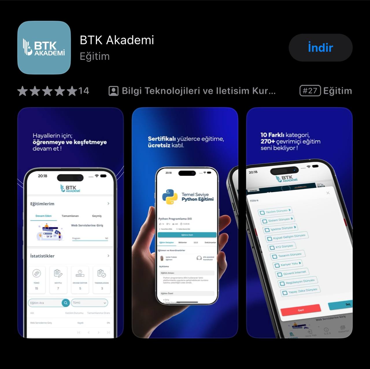 BTK Akademi mobil uygulamasına Google Play ve App Store'dan ulaşabilirsiniz.