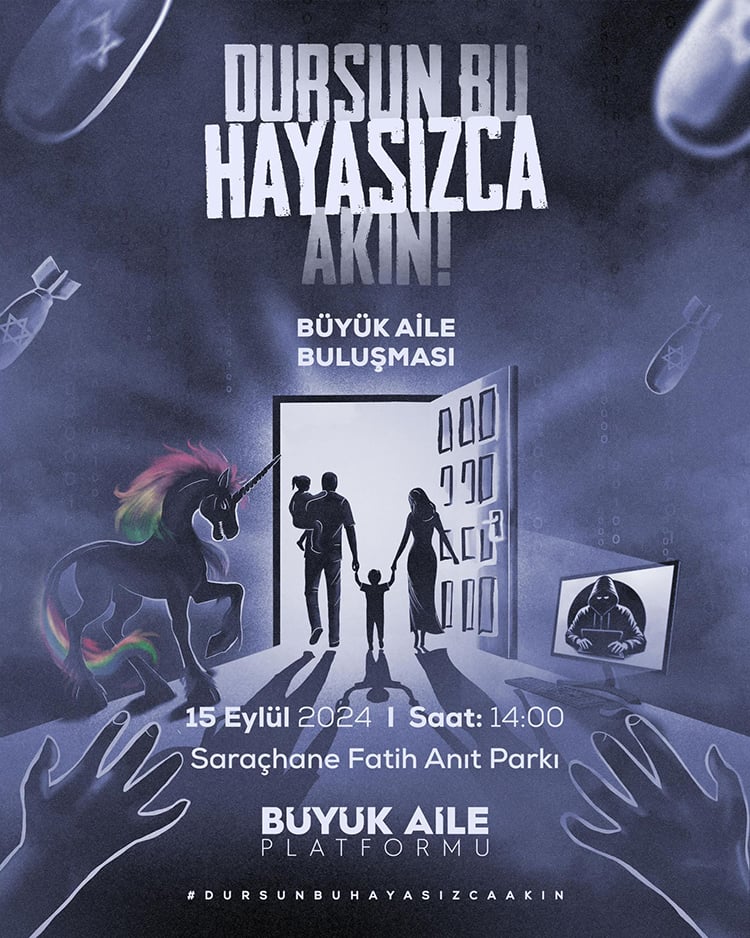 Büyük Aile Platformu Genel Sekreteri Serdar Eryılmaz, 15 Eylül'de "Dursun Bu Hayasızca Akın" sloganıyla "Büyük Aile Buluşması ve Sessiz Yürüyüş" düzenleyeceklerini belirtti.
