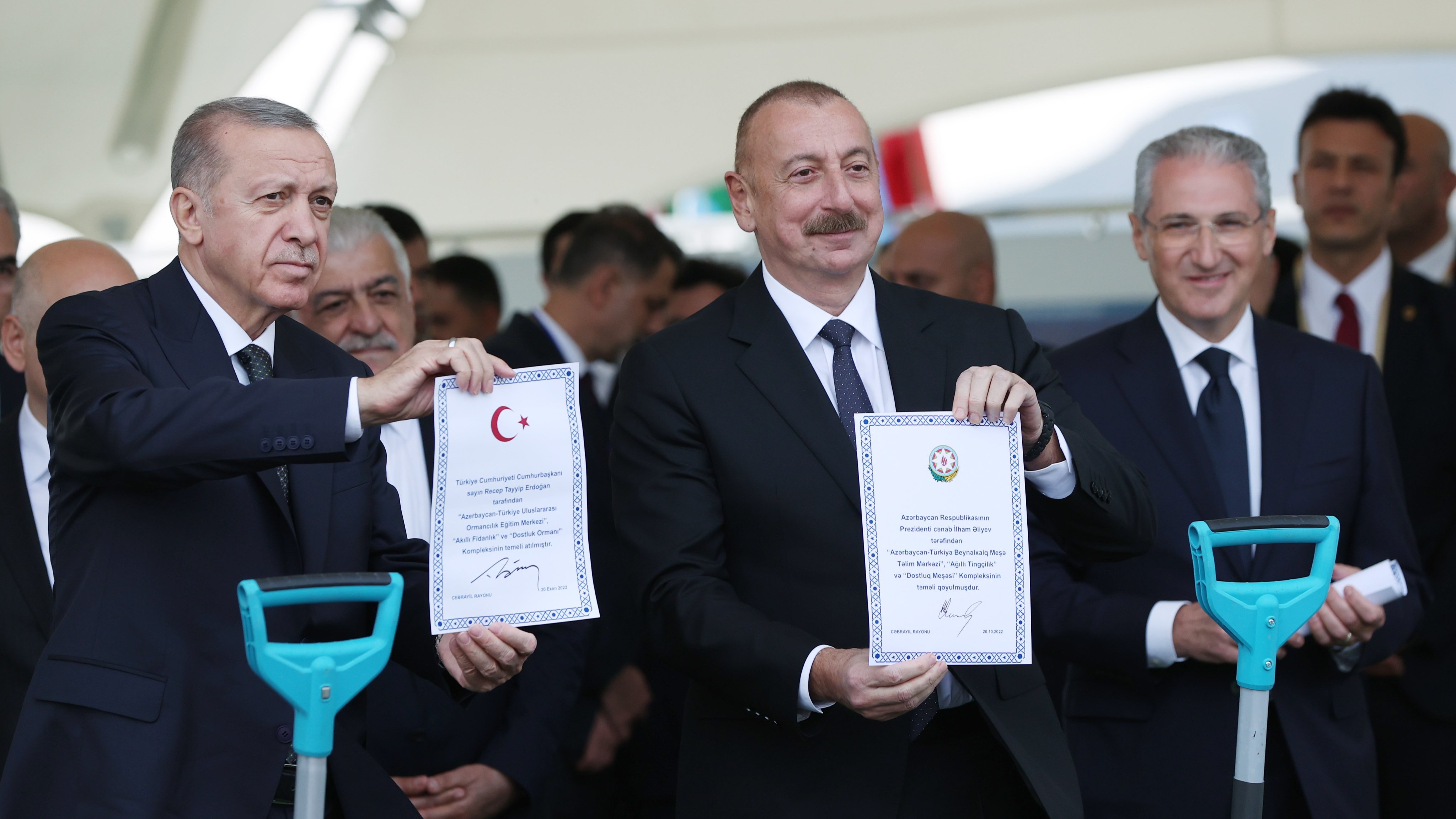 Erdoğan ve Aliyev Azerbaycan'ın zaferini kutladılar, karşılıklı dayanışma sözlerini yinelediler ve Nahçıvan'dan Ermenistan'a uzanacak ve iki ülkeyi birbirine bağlayacak bir kara koridoruna atıfta bulundular.