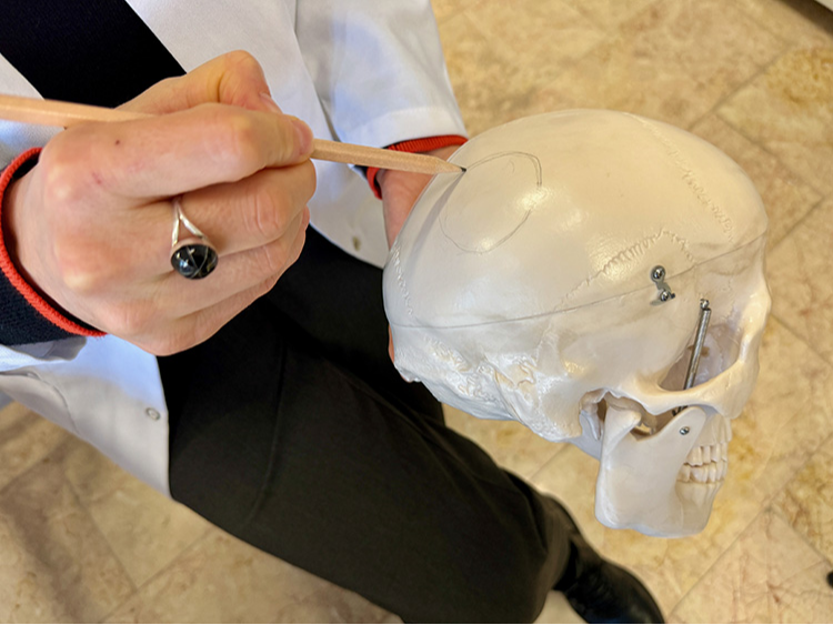 "Kafatasının yan tarafında yaklaşık 2,5 santimetre çapında, düzgün şekilde açılan dairesel bir kesitle yuvarlak bir kemik parça çıkartılmış. Bu esnada kafa derisini sıyırdıklarını gösteren birçok kesi iziyle karşılaştık.