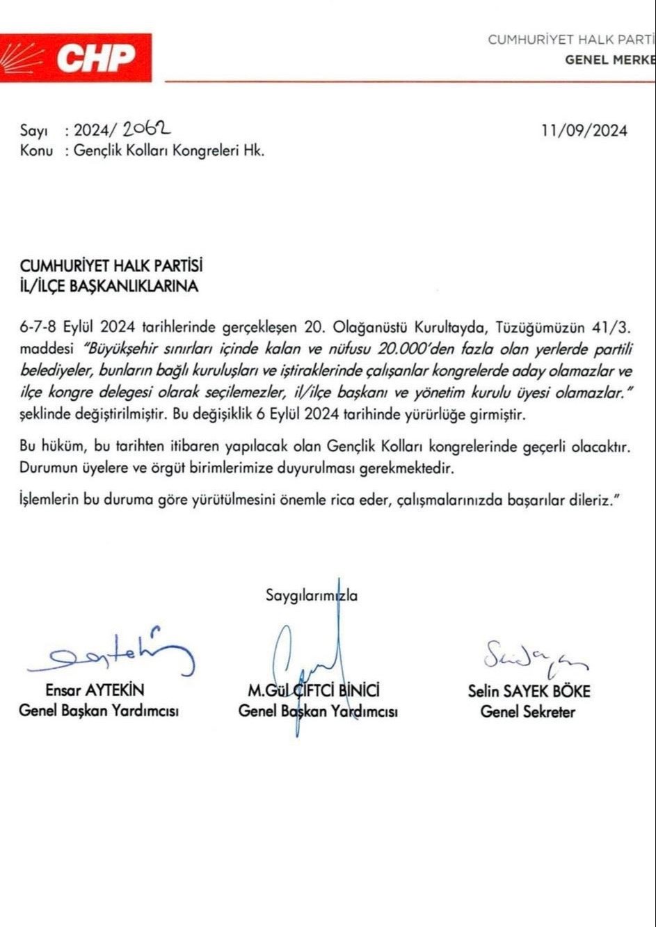 CHP Genel Merkezinin yayınladığı genelge ile tüzük maddesinin 6 Eylül’den itibaren geçerli olduğu hatırlatılarak, aynı hükmün Gençlik Kolları seçiminde de uygulanacağı belirtildi.