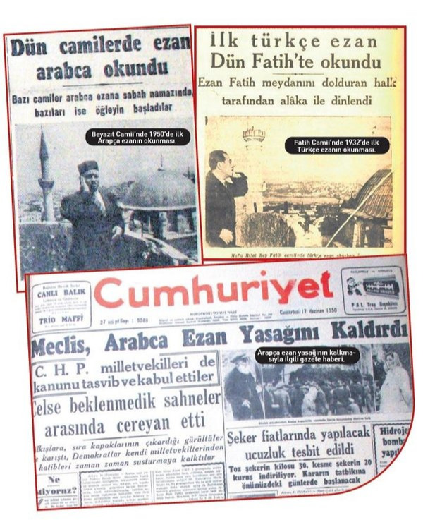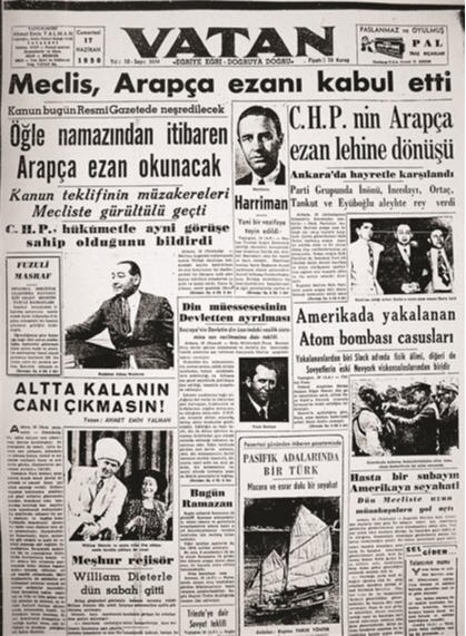 17 Haziran 1950 tarihinde yayınlanan Vatan Gazetesi'nin manşetindeki bir haberde ezanın aslında dönmesi konusunda verilen kanun teklifine CHP Genel Başkanı İsmet İnönü'nün aleyhte oy verdiği net bir şekilde görülüyor. Parti liderinin aksi yönde oy verdiği bir konuda CHP'nin nasıl öncü olmuş olabileceği merak konusu oldu.