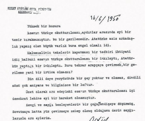 Malumuâliniz tekkelerin kapanması bir tedbir-i ihtiyati idi; halbuki ezanın Türkçe okutturulması bir inkılaptı, Atatürk'ün yaptığı bir inkılaptı. Bunu tekrar Arapça'ya çevirmek, bir gerileme yani bir irtica olmaz mı? Din dili diye yeryüzünde bir şey yoktur ve olamaz, din dili sözü çok amiyane ve bilgisizce bir laftır. Özet olarak arz edeyim ki ezanın Türkçe okutturulma(ma)sı işi Demokrat lehine iyi bir hareket olmamıştır.