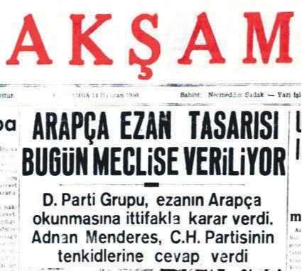 1950 seçimlerinde Demokrat Parti’nin iktidara gelmesinin hemen ardından ilk gündem maddesini “Arapça ezan okuma yasağının kaldırılması” oluşturdu. Demokrat Parti’nin verdiği kanun teklifini CHP de destekledi. Değişikliği Cumhurbaşkanı Celal Bayar da onaylayınca ezan Arapça okunmaya başladı. Camilerin etrafında toplanan halk sevinçten secdeye kapandı.
