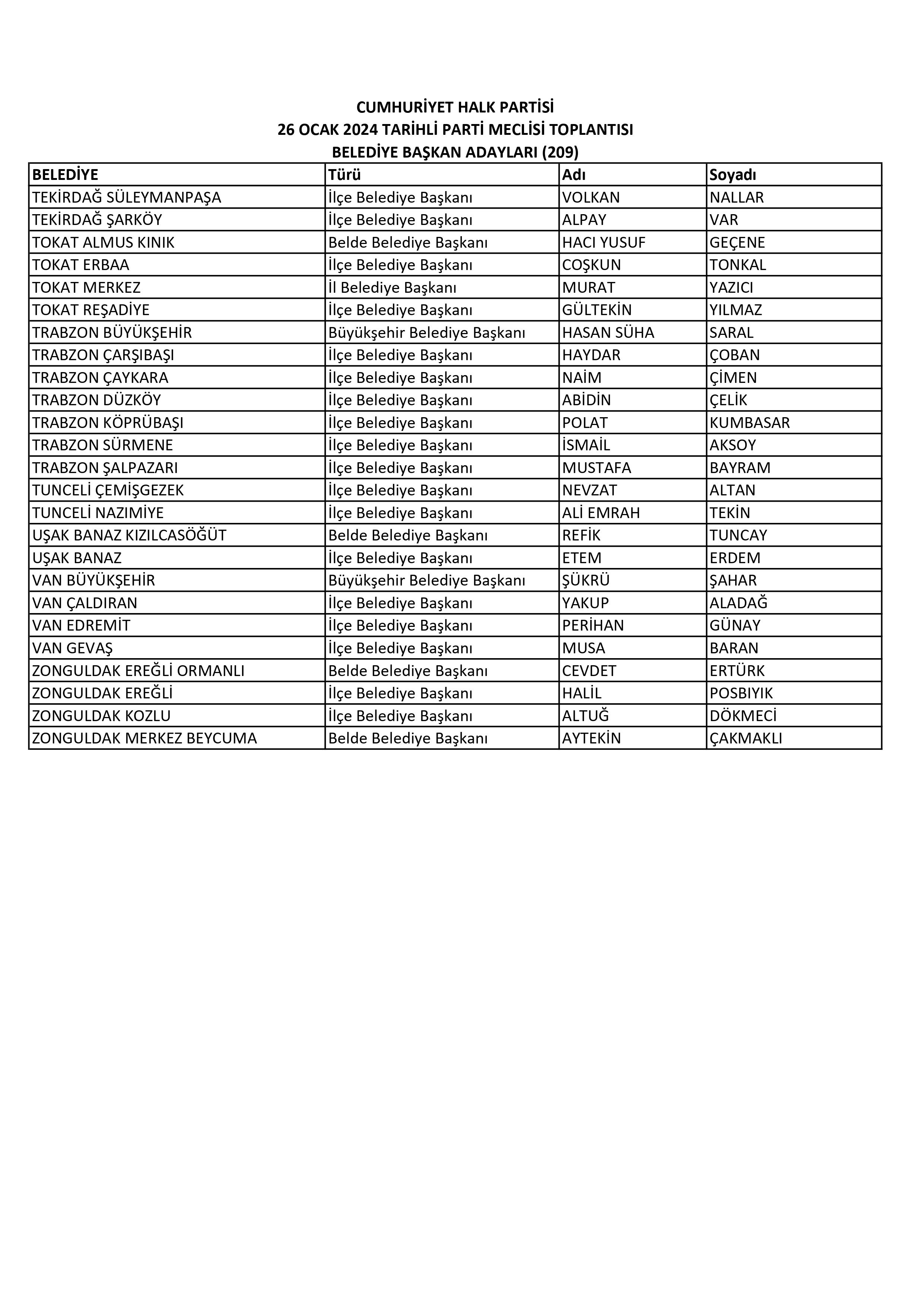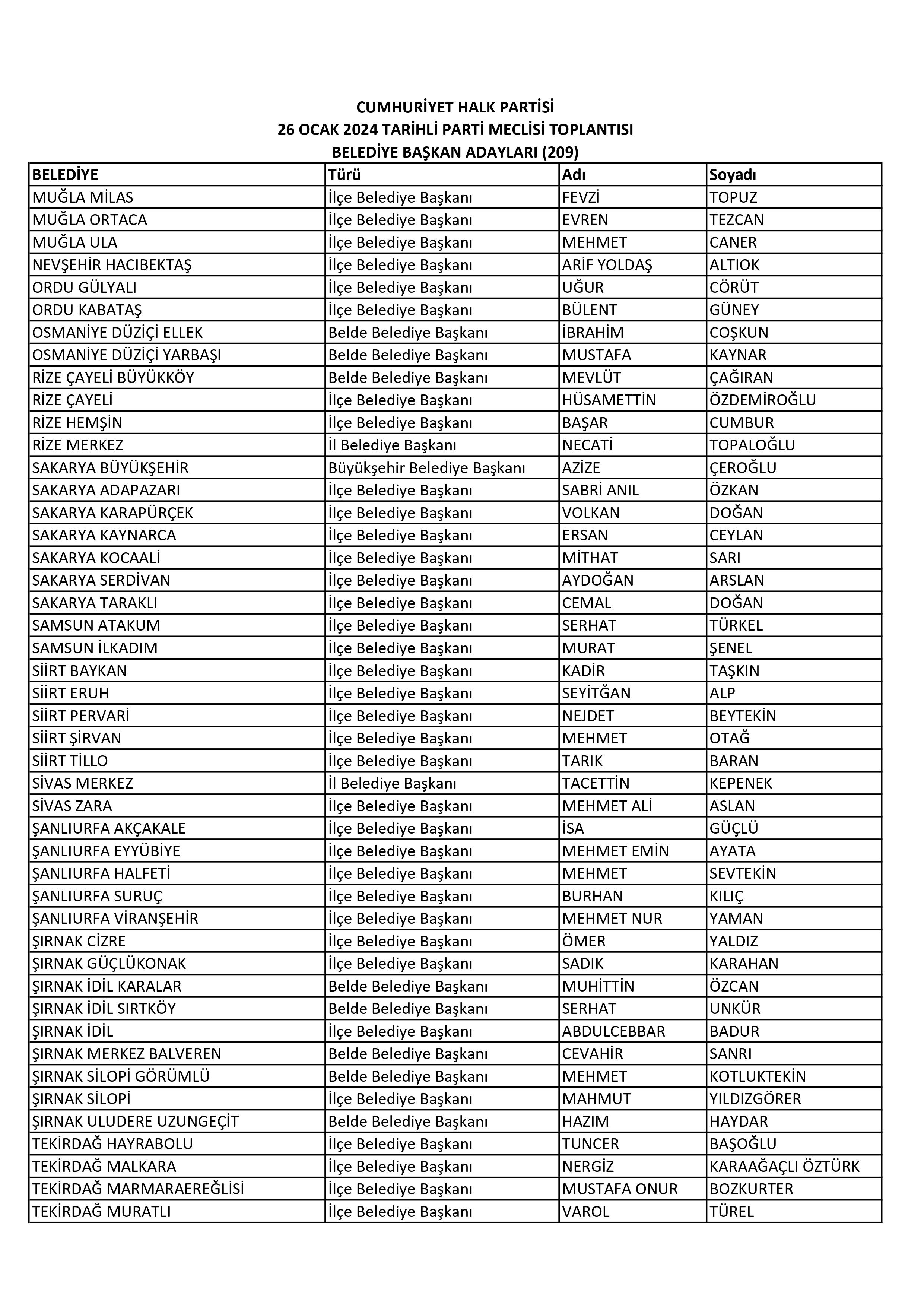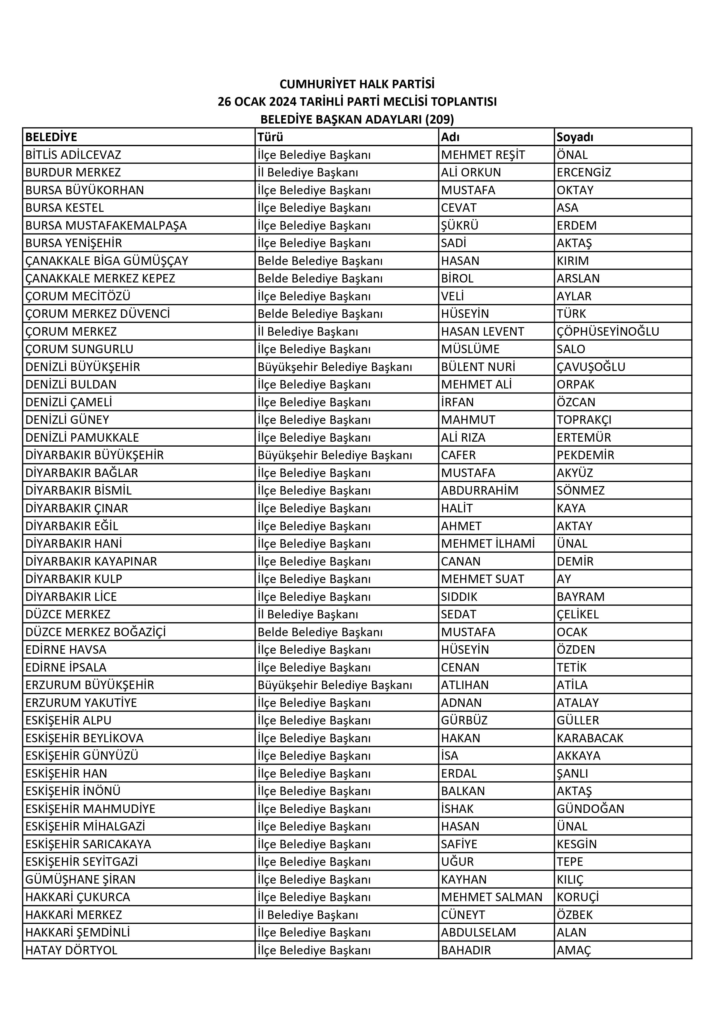 Toplantının ardından yapılan yazılı açıklamaya göre, CHP, Antalya Büyükşehir Belediyesinde Muhittin Böcek'i, Denizli Büyükşehir Belediyesinde Bülent Nuri Çavuşoğlu'nu, Diyarbakır Büyükşehir Belediyesinde Cafer Pekdemir'i, Erzurum Büyükşehir Belediyesinde Atlıhan Atila'yı, Muğla Büyükşehir Belediyesinde Ahmet Aras'ı, Sakarya Büyükşehir Belediyesinde Azize Çeroğlu'nu, Trabzon Büyükşehir Belediyesinde Hasan Süha Saral'ı ve Van Büyükşehir Belediyesinde Şükrü Şahar'ı aday gösterdi.