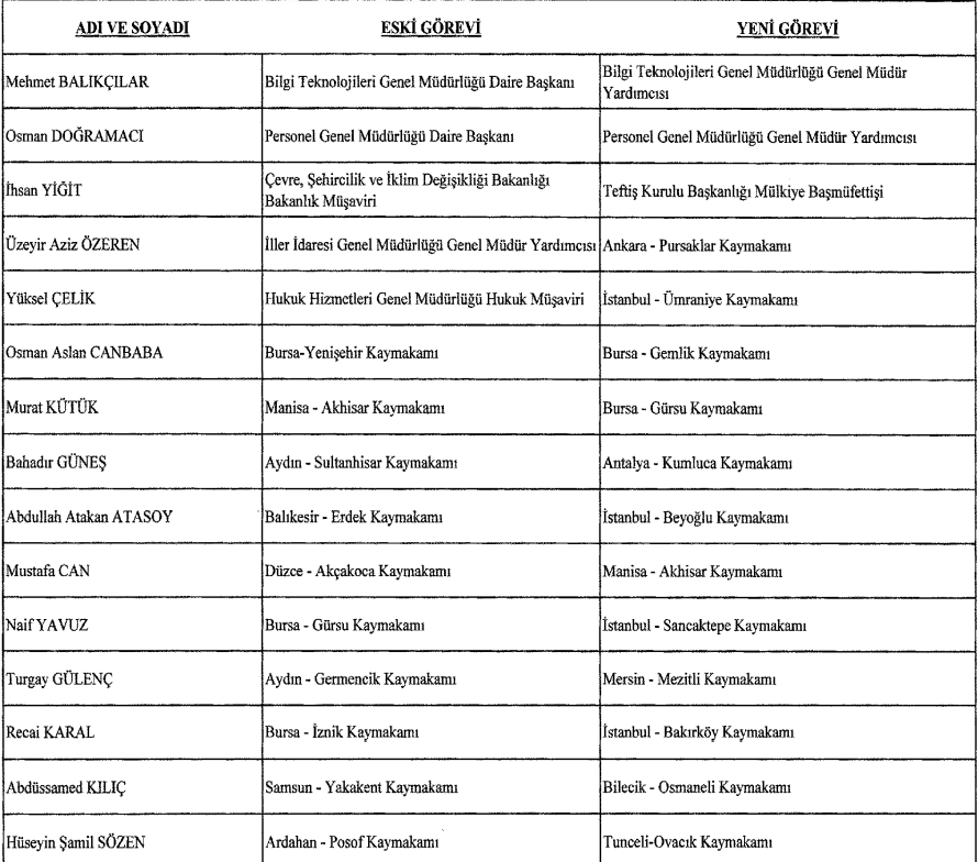 Teftiş Kurulu Başkanlığına Mülkiye Başmüfettişi Yavuz Selim Akkoç, Göç İdaresi Başkanlığı Başkan Yardımcılığına Düzensiz Göçle Mücadele ve Sınır Dışı İşleri Genel Müdürü Ramazan Seçilmiş, Göç İdaresi Başkanlığı Sınır Yönetimi Genel Müdürlüğüne Mülkiye Müfettişi Ozan Gazel, Göç İdaresi Başkanlığı Yabancılar Genel Müdürlüğüne Fatih Ayna getirildi.