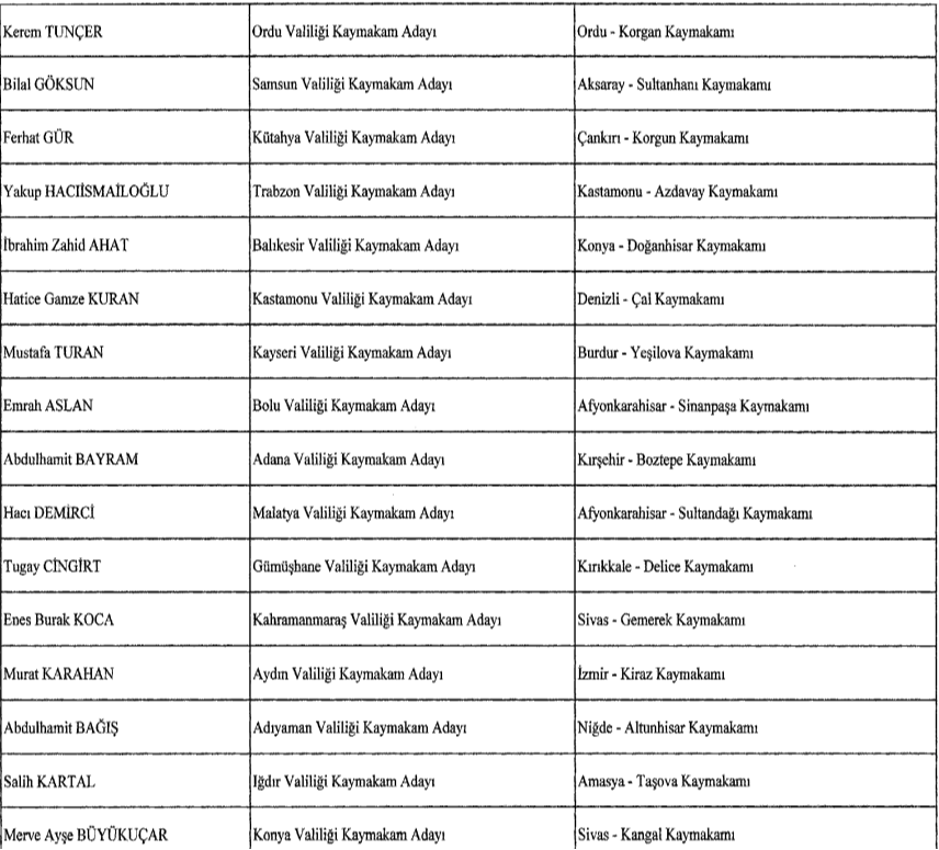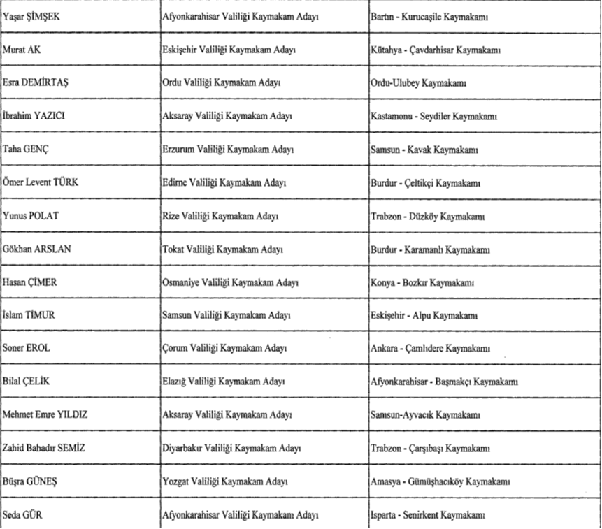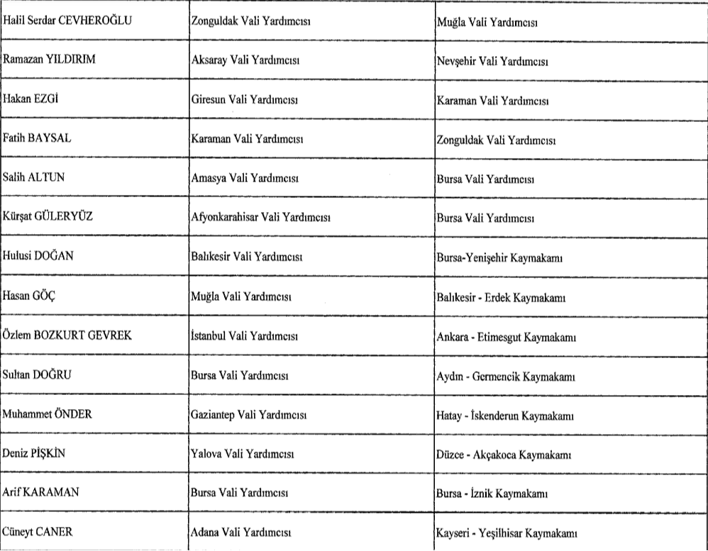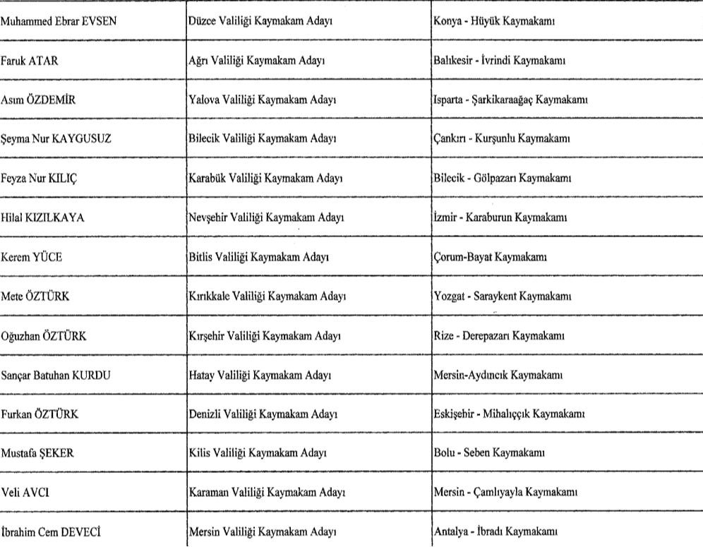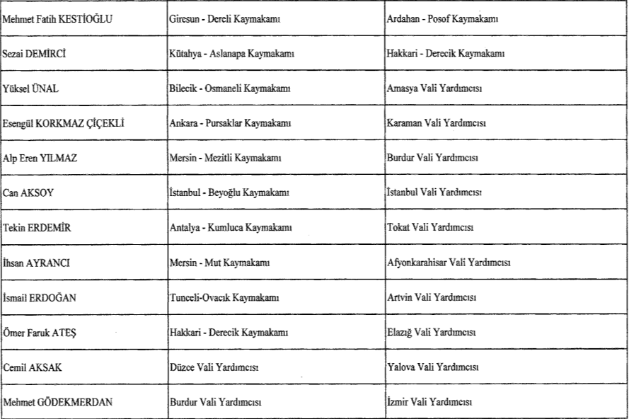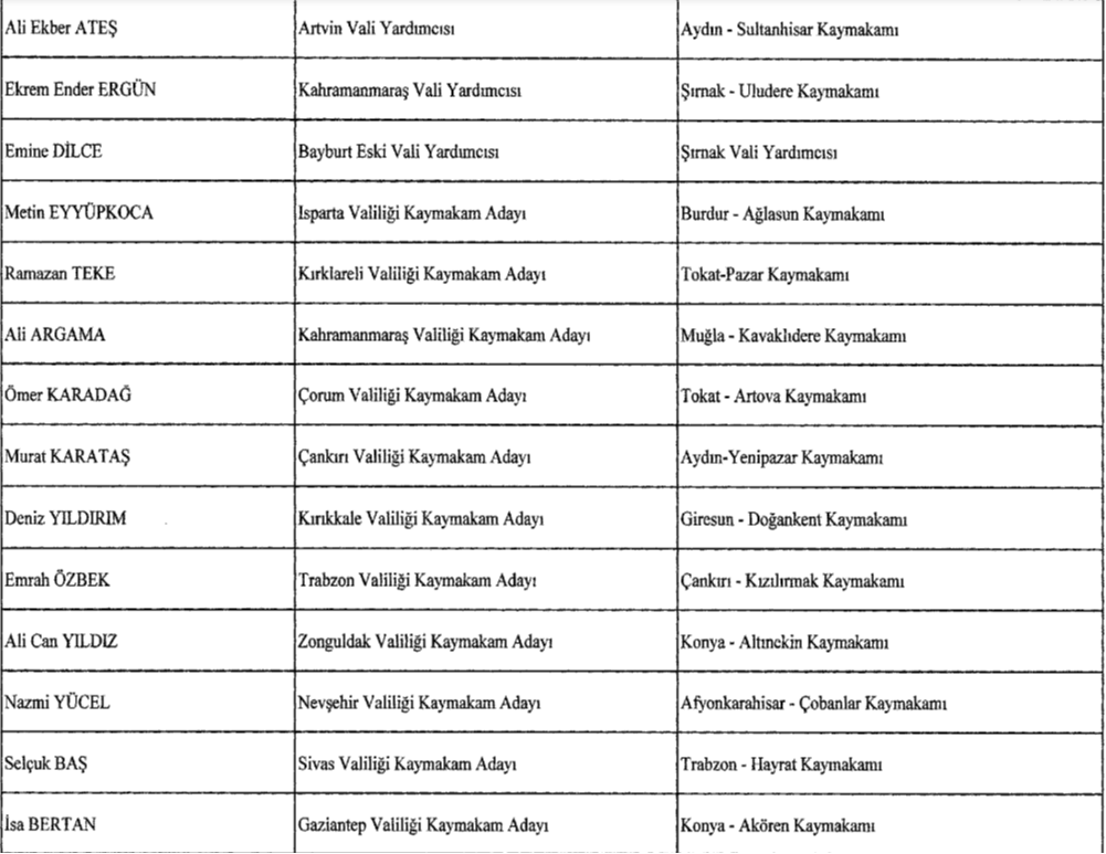 Resmi Gazete'de yayımlanan Cumhurbaşkanı Atama Kararları'na göre 15 ile vali yardımcısı ve 121 ilçeye kaymakam atandı. Öte yandan İçişleri Bakanlığı, Kültür ve Turizm Bakanlığı, Milli Eğitim Bakanlığı ile Çevre, Şehircilik ve İklim Değişikliği Bakanlıklarındaki bazı kademelere de yeni atamalar yapıldı.