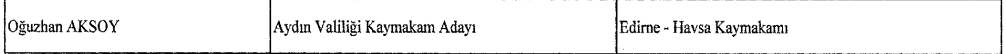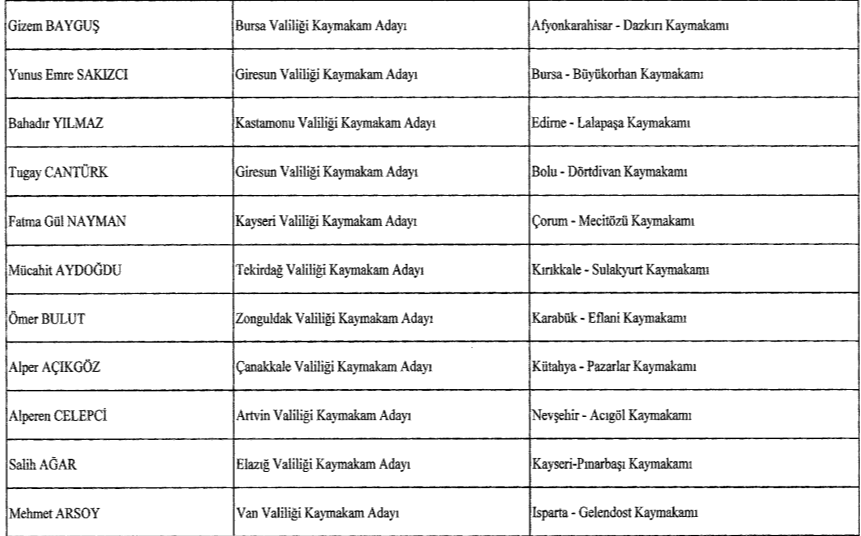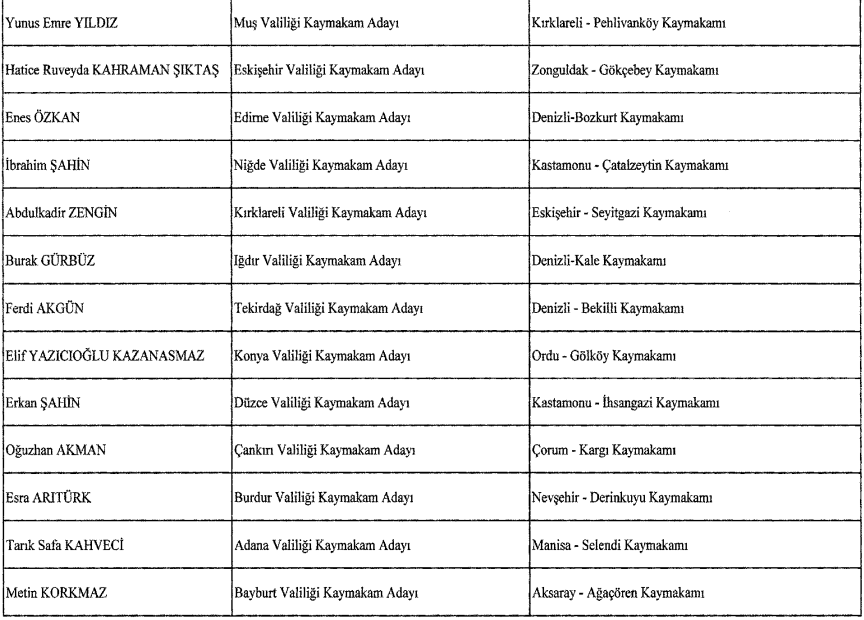 2 Kasım 2024 tarihli ve 2024/387 sayılı kararla Bilecik Osmaneli Kaymakamı Yüksel Ünal Amasya Vali Yardımcılığına, Ankara Pursaklar Kaymakamı Esengül Korkmaz Çiçekli Karaman Vali Yardımcılığına, Mersin Mezitli Kaymakamı Alp Eren Yılmaz Burdur Vali Yardımcılığına, İstanbul Beyoğlu Kaymakamı Can Aksoy İstanbul Vali Yardımcılığına, Antalya Kumluca Kaymakamı Tekin Erdemir Tokat Vali Yardımcılığına, Mersin Mut Kaymakamı İhsan Ayrancı Afyonkarahisar Vali Yardımcılığına, Tunceli Ovacık Kaymakamı İsmail Erdoğan Artvin Vali Yardımcılığına, Hakkari Derecik Kaymakamı Ömer Faruk Ateş Elazığ Vali Yardımcılığına, Düzce Vali Yardımcısı Cemil Aksak Yalova Vali Yardımcılığına, Burdur Vali Yardımcısı Mehmet Gödek Merdan İzmir Vali Yardımcılığına, Zonguldak Vali Yardımcısı Halil Serdar Cevheroğlu Muğla Vali Yardımcılığına, Aksaray Vali Yardımcısı Ramazan Yıldırım Nevşehir Vali Yardımcılığına, Giresun Vali Yardımcısı Hakan Ezgi Karaman Vali Yardımcılığına, Karaman Vali Yardımcısı Fatih Baysal Zonguldak Vali Yardımcılığına, Amasya Vali Yardımcısı Salih Altun Bursa Vali Yardımcılığına, Afyonkarahisar Vali Yardımcısı Kürşat Güleryüz Bursa Vali Yardımcılığına ve Bayburt Eski Vali Yardımcısı Emine Dilce Şırnak Vali Yardımcılığına atandı.
