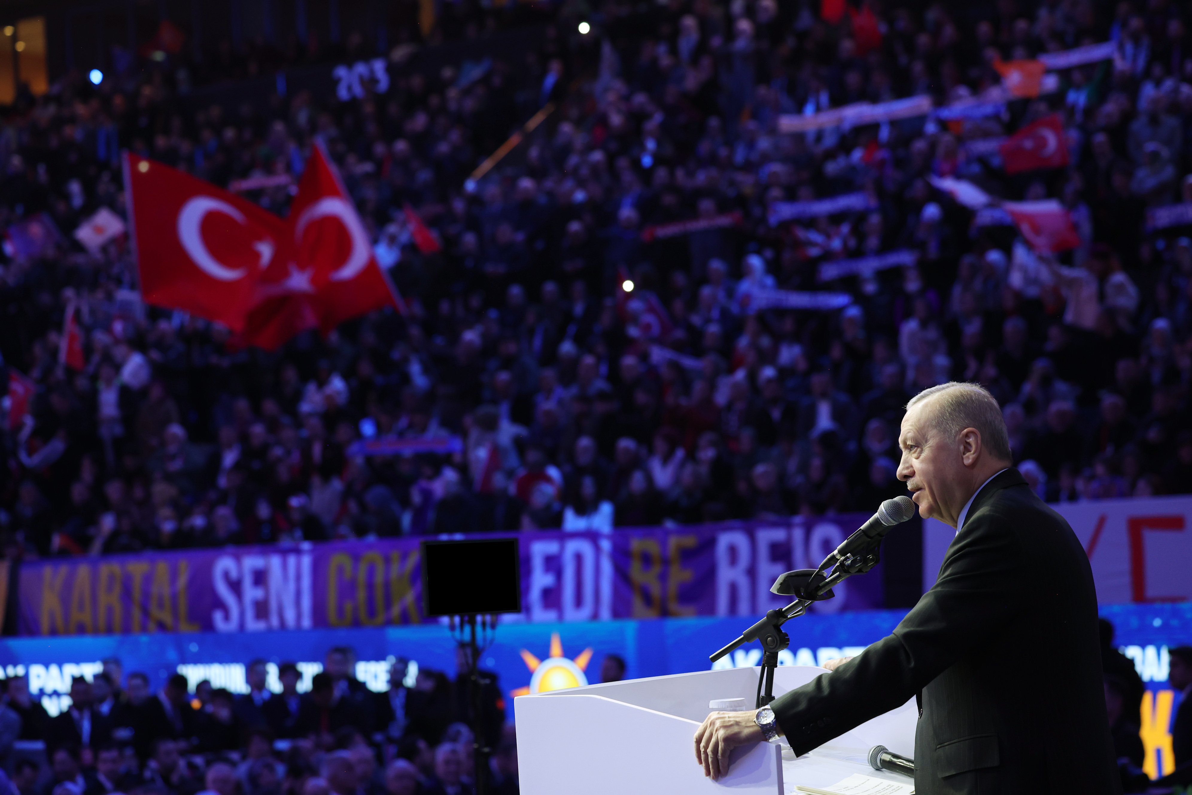Üye sayısıyla, dünyanın en büyük partileri sıralamasında ilk 5'te yer alan bir siyasi kuruluşuz. Bundan 4 ay önce, iktidardaki 22 yılımızı şanla, şerefle, dünya siyaset literatürüne geçen muazzam bir başarıyla tamamladık. Bu eşsiz başarıya, öyle çilingir sofralarında kadeh tokuşturarak, kaynağı belirsiz balya balya paralardan kuleler yaparak ulaşmadık. Bu tarihi başarıyı aziz milletimizin umutlarını, beklentilerini, hayallerini siyasete taşıyarak yakaladık."