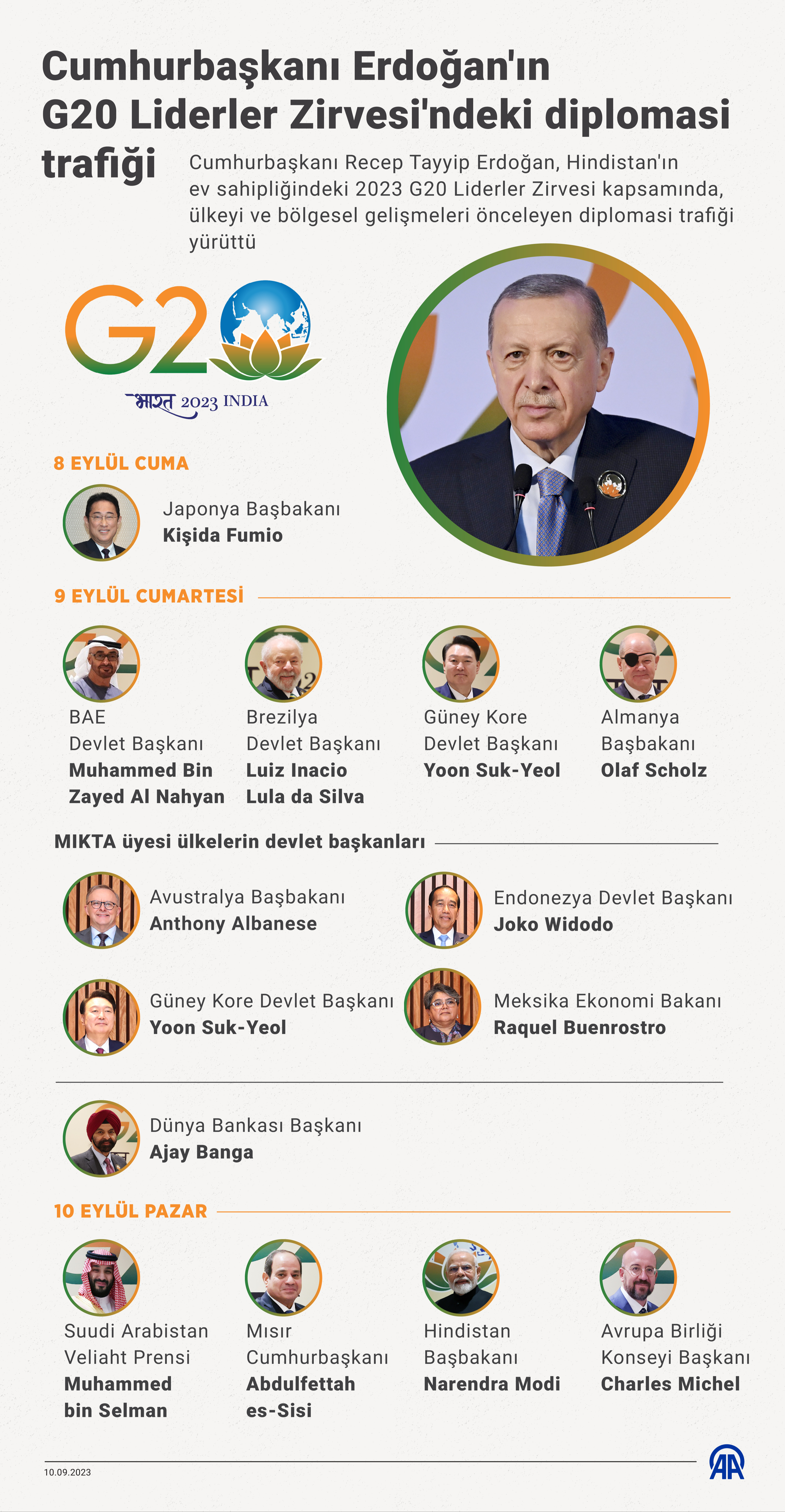 Cumhurbaşkanı Recep Tayyip Erdoğan, Hindistan'ın ev sahipliğindeki 2023 G20 Liderler Zirvesi'nde yoğun bir diplomasi trafiği yürüttü.