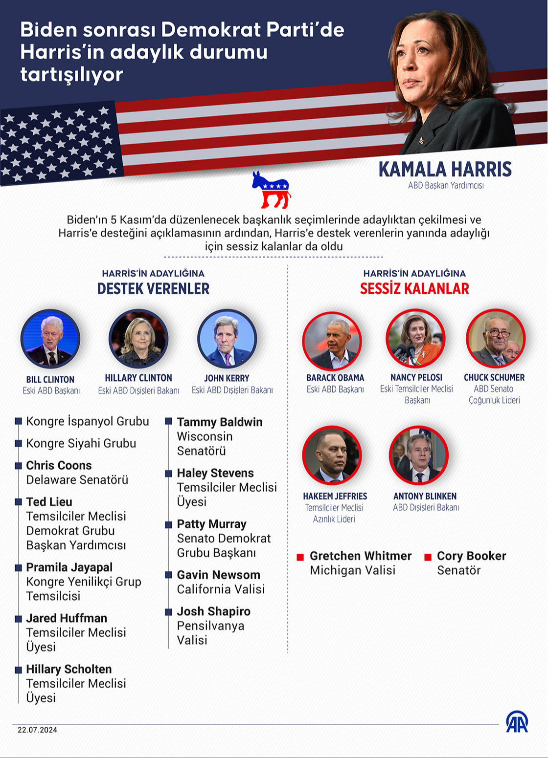 Öte yandan Demokrat Parti'de birçok isim, Harris'e desteklerini ilan etti.
