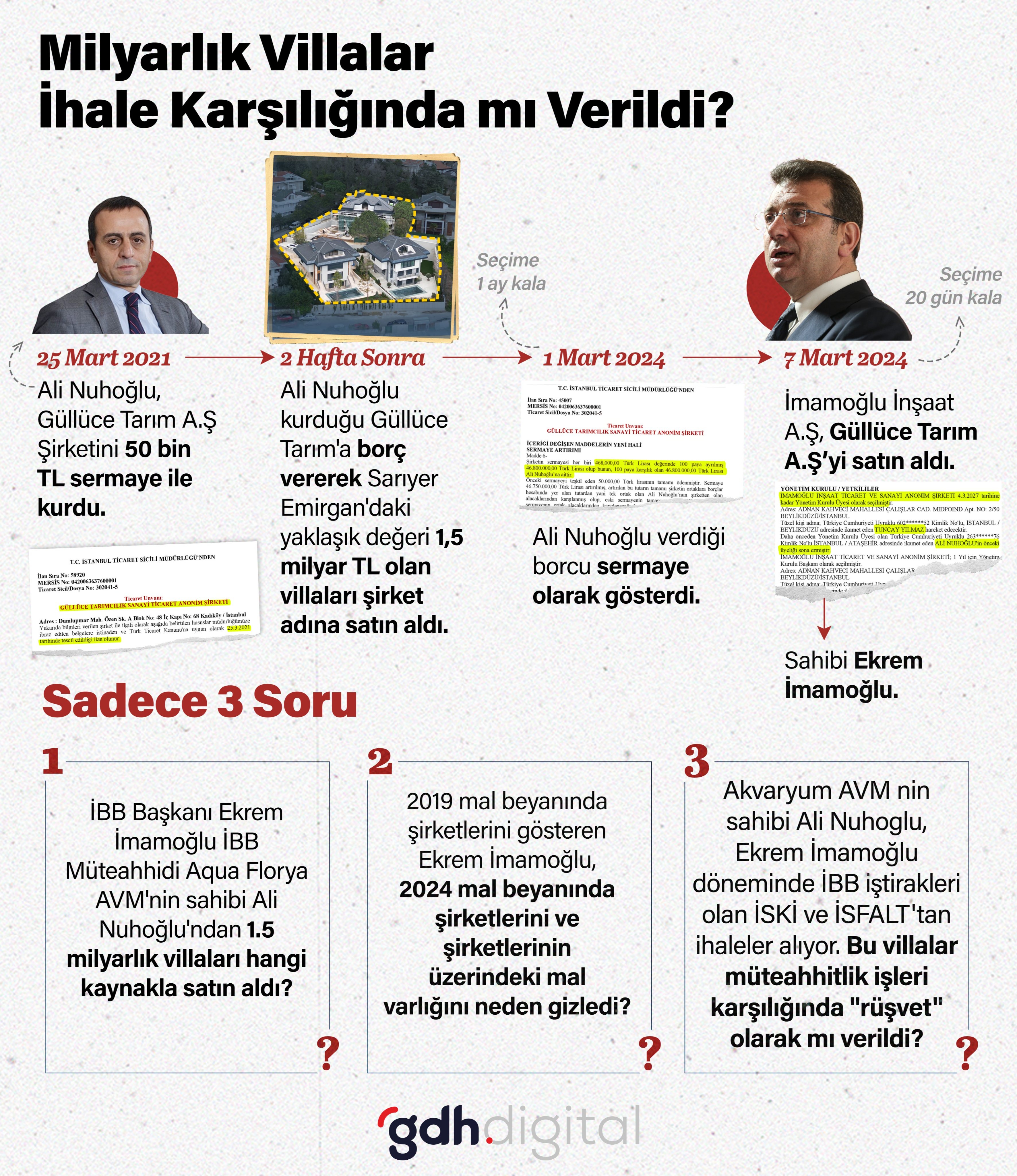 Bu süre zarfında faal olan Güllüce Tarım 7 Mart 2024 tarihinde İmamoğlu İnşaat A.Ş.’ye devredildi. Bu tarihten 20 gün sonra yerel seçimler gerçekleşmişti. Aynı gün Ekrem İmamoğlu, mal beyanını açıkladı. Mal beyanında bu villaların neden gösterilmedi hala merak konusu.