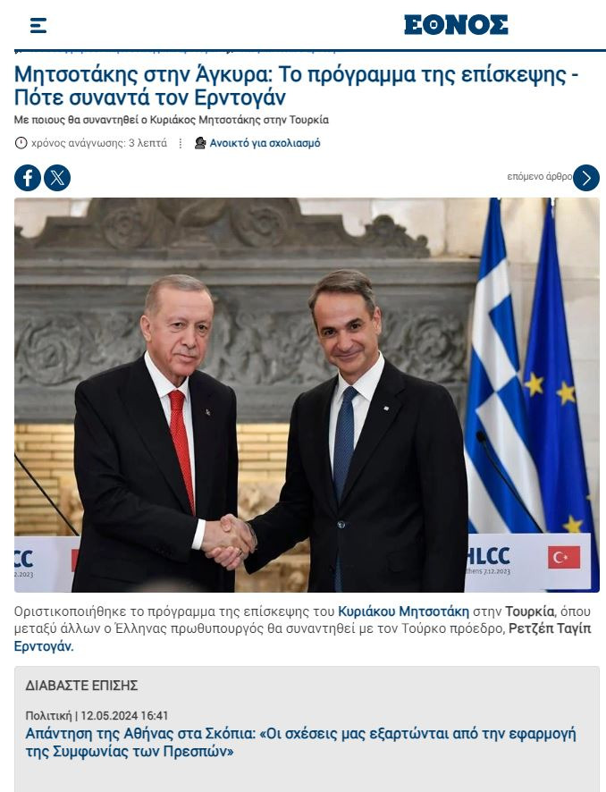 Ethnos gazetesi ise iki liderin bugünkü görüşmeden sonraki programını öne çıkarttı.