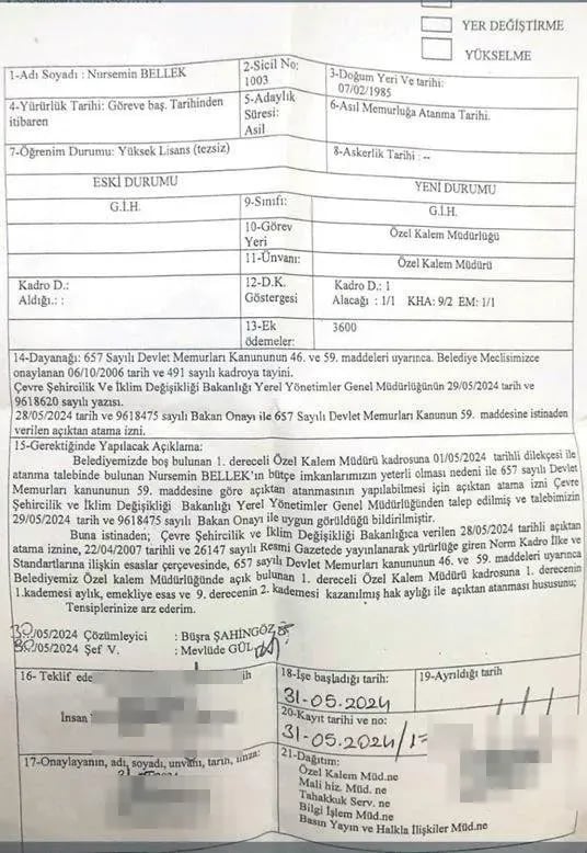 Görevine gelmeyen Bellek'in yerine ise Seda Dilber'in asıl özel kalem müdürü vazifesini yürüttüğü belirlendi.