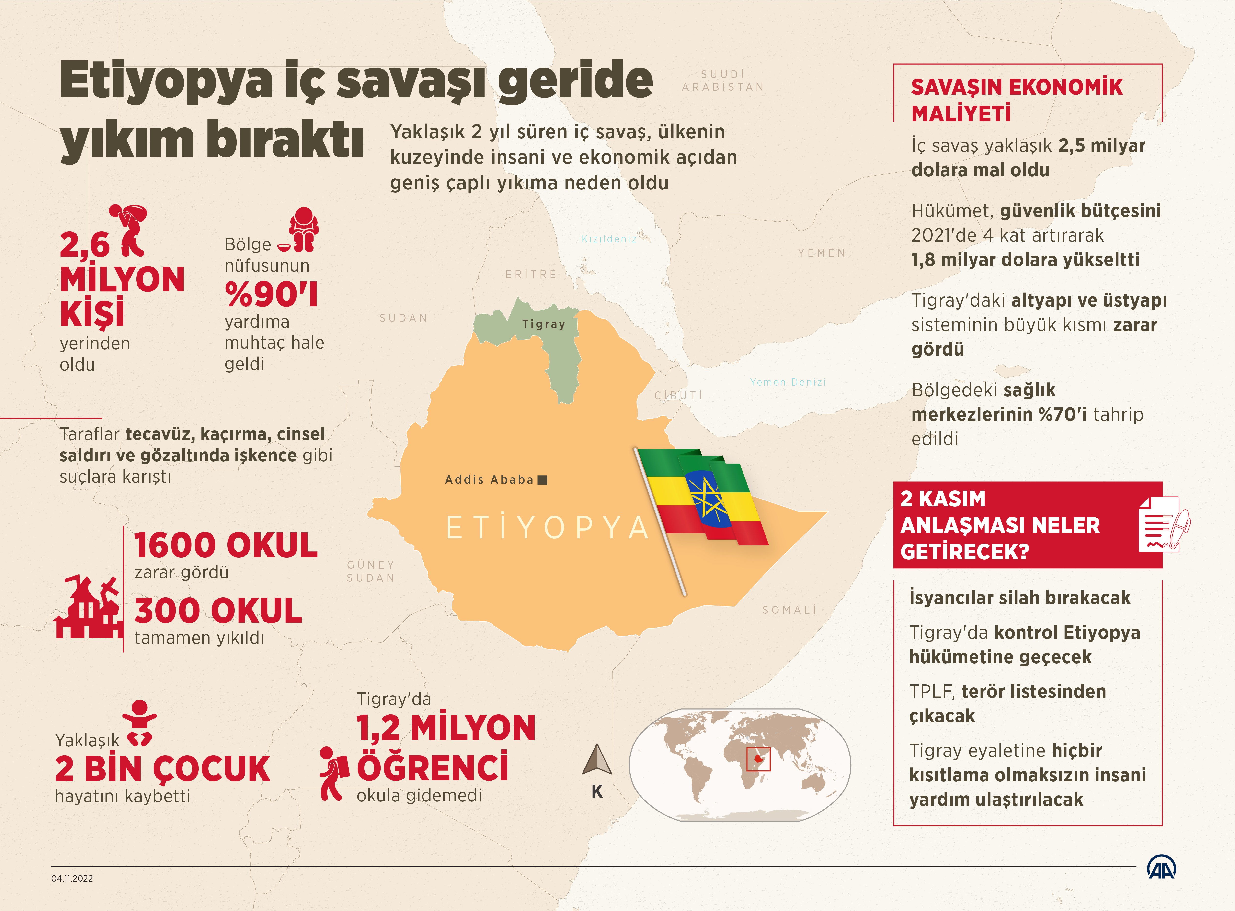 Etiyopya'da 2 yıl önce başlayan iç savaş, ülkenin kuzeyinde geniş çaplı yıkıma neden olurken maddi kayıpların yanında milyonlarca kişinin hayatını da olumsuz etkiledi. İç savaş öncesi ülkenin en gelişmiş eyaletlerinden Tigray'da nüfusun yarısı yardıma muhtaç hale geldi, bölgenin eğitim ve sağlık altyapısı çöktü.