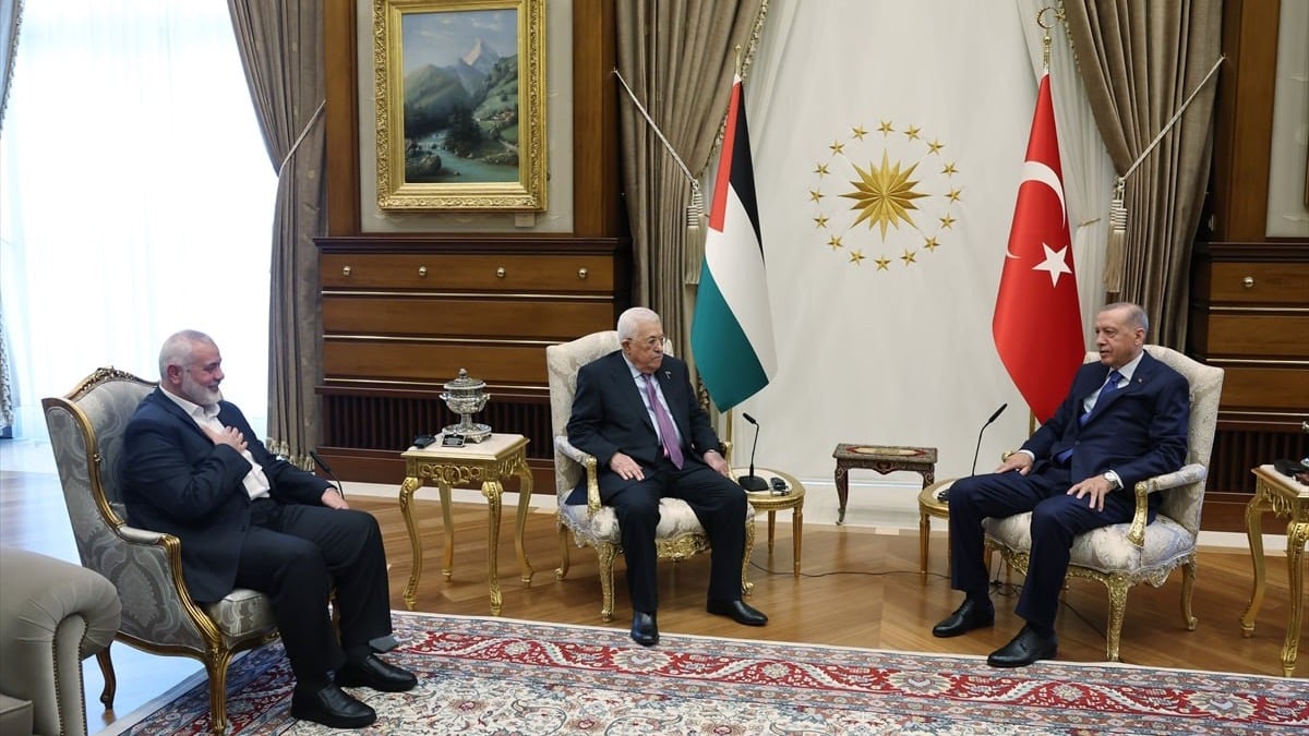 Cumhurbaşkanı Erdoğan başkanlığında Filistin Devlet Başkanı Mahmud Abbas ile Hamas Siyasi Büro Başkanı İsmail Heniyye Cumhurbaşkanlığı Külliyesi'nde üçlü görüşme gerçekleşti.
